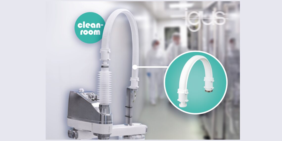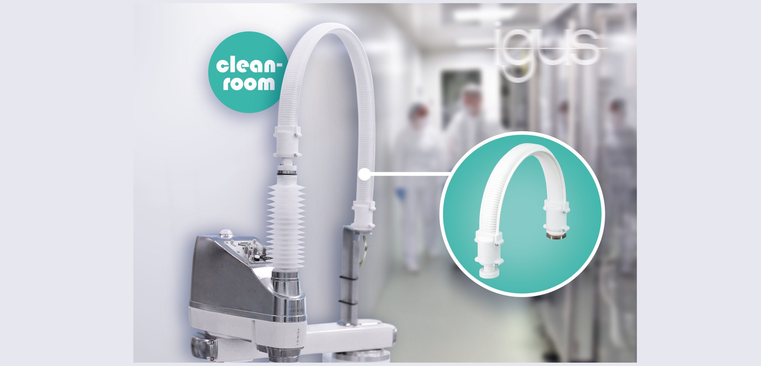 Die Clean SCARA Cable Solution, bestehend aus tribologisch optimierten Hochleistungskunststoffen und bei High-Speed-Anwendungen nahezu partikelfrei nach ISO Klasse 2 arbeitend, wurde von igus für SCARA-Roboter in Reinräumen auf den Markt gebracht. Das System punktet im Vergleich zu klassischen Wellschläuchen mit hoher Stabilität und Bedienerfreundlichkeit.