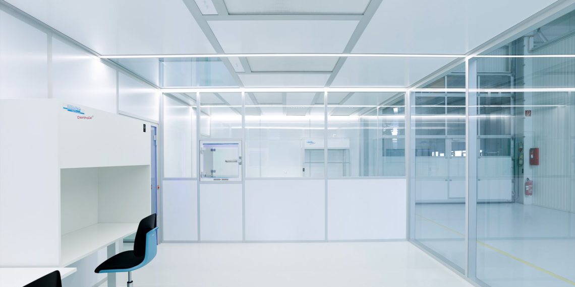 Wand- und Deckenmodule des Reinraumsystems sind mit einem silikonfreien Dicht-Clip-System verbunden, das für eine hohe Dichtheit des Raumes sorgt. Aufgrund der patentierten Verbindung konnte die seitliche Reinraumwand des ursprünglichen Reinraums zerstörungsfrei abgebaut und die bestehenden Wand- und Deckenelemente an den neuen Reinraum angeschlossen werden. Mithilfe einer provisorischen Staubschutzwand wurde die Produktion während der Umbaumaßnahme vollständig weitergeführt.