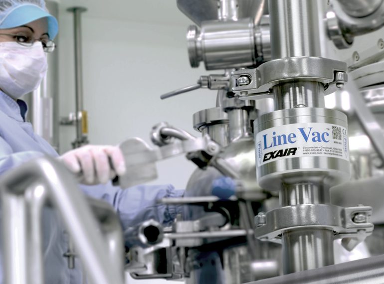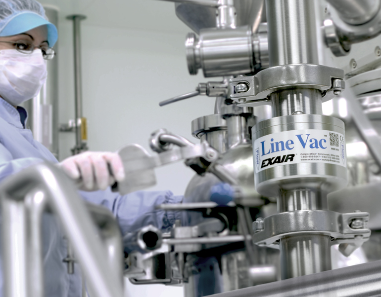 Der Sanitary Flange Line Vac ist in den unterschiedlichsten Industriebereichen einsetzbar. Eine pharmazeutische Fabrik benutzte ein wartungsintensives und Gebläse-betriebenes Förderband, um Kapseln von einer Abfüllpresse zu einem Trockner zu transportieren. Sie installierte ein Edelstahl-Rohrleitungssystem, das mit Sanitärflanschen und einem Sanitary Flange Line Vac ausgestattet war. Die einfache Installation und der Wegfall der für das Gebläse-System erforderlichen schweren Wartung machten das Projekt zu einem großen Erfolg.