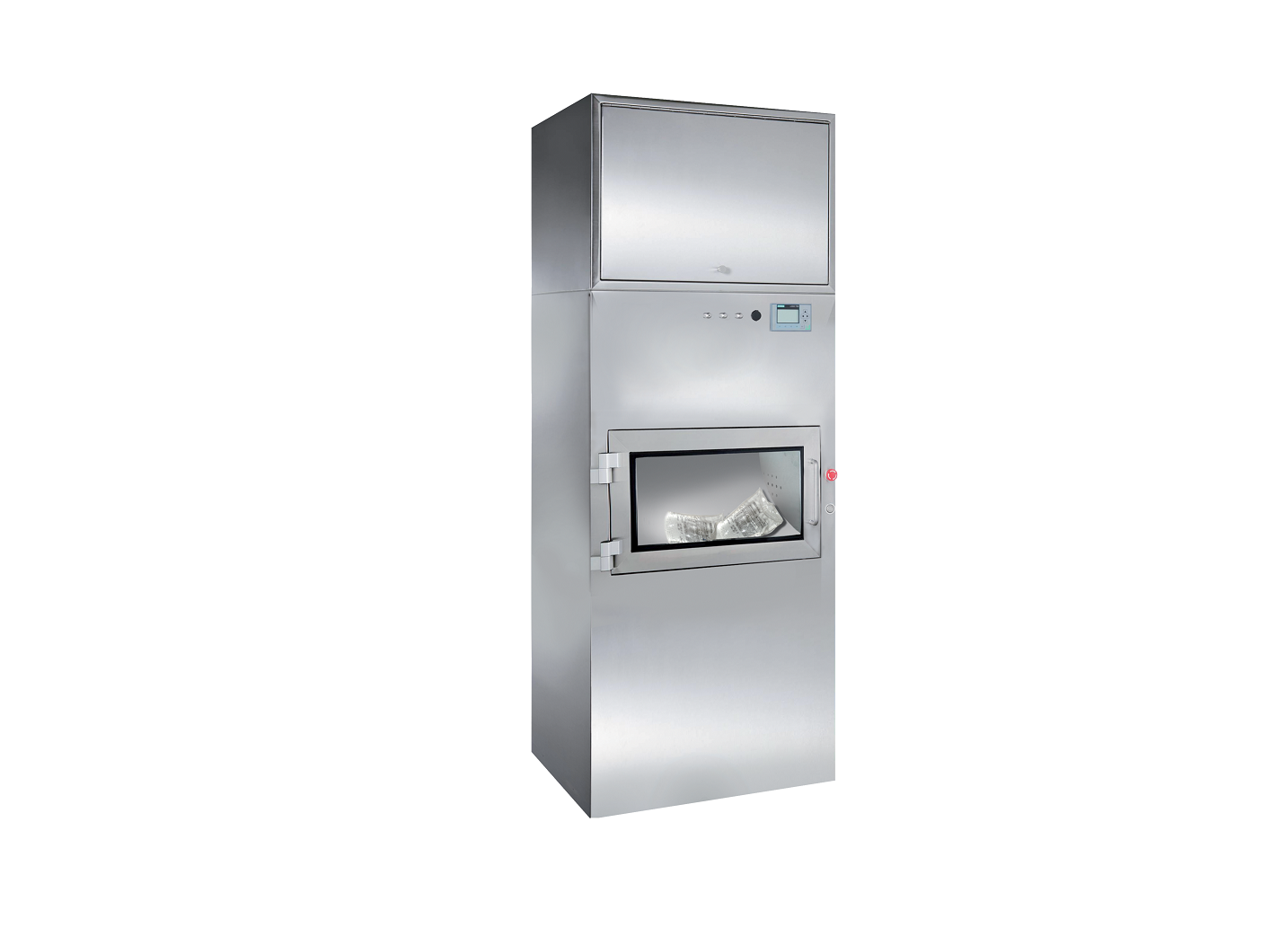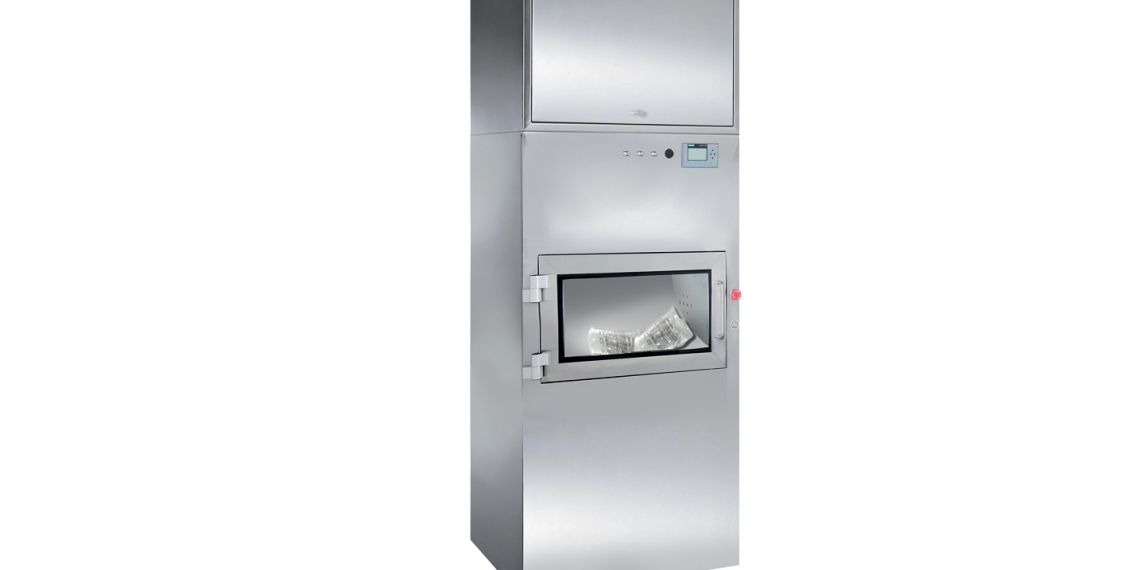Wie sieht diese neue, patentierte Lösung aus? Ziel war es, sicher zu stellen, dass bei der Entnahme der Ware vom unreinen Bereich keine Rückkontamination in den Reinstbereich erfolgen kann. Umgesetzt wurde das über eine so einfache wie geniale Konstruktion: es wurde eine Schleuse mit zwei Ebenen entwickelt; die Ware im oberen, reinen Beladebereich wird durch eine Klappe geschoben und rutscht dann über die Schwerkraft in einen tiefer gelegenen Entladebereich. Danach werden die Klappe sowie die reine Tür der Schleuse elektronisch verriegelt. Erst dann kann von dem unteren, unreinen Entladebereich die Ware entnommen werden. Bei diesem Schritt ist es durch den Höhenversatz der Ebenen und der Verriegelung der Durchreicheklappe nicht mehr möglich, von der unreinen Seite Oberflächen des reinen Bereiches zu erreichen und damit zu kontaminieren; der reine Bereich bleibt sicher geschützt.