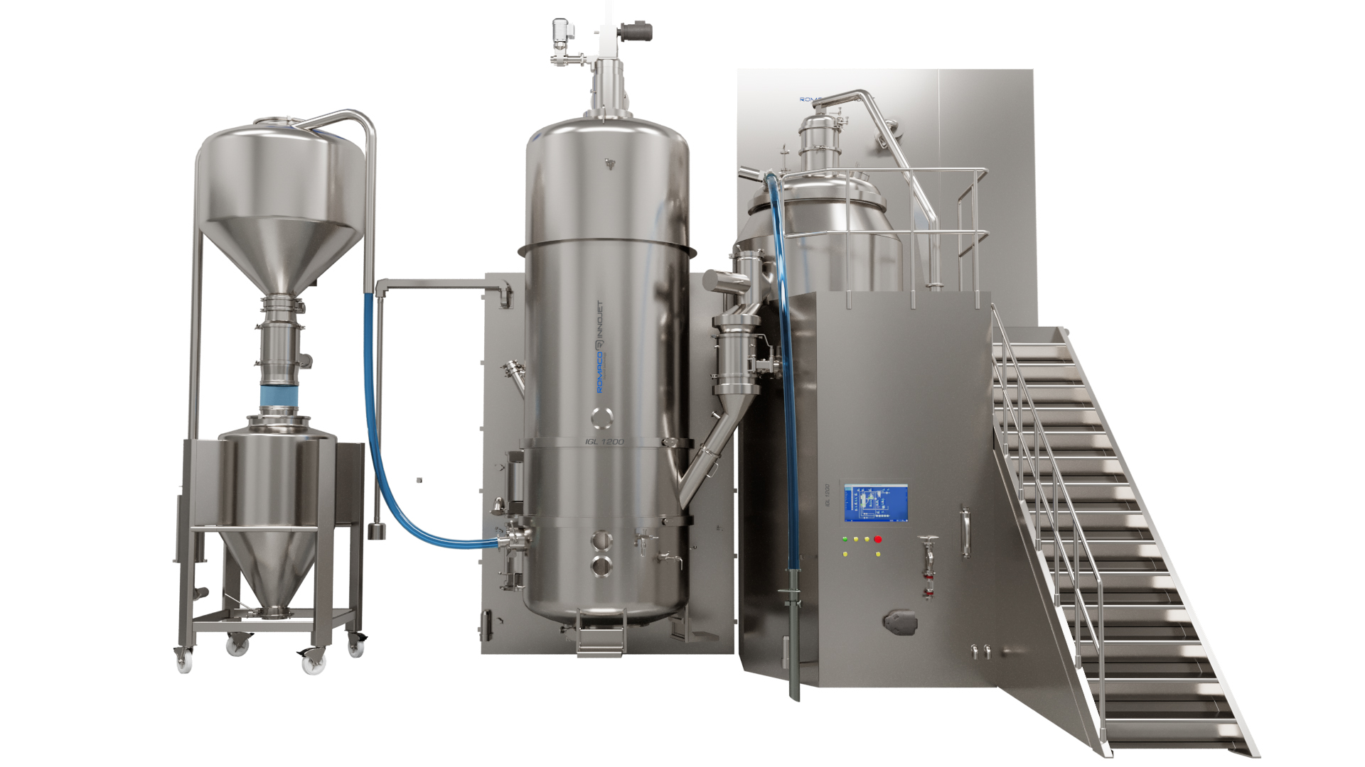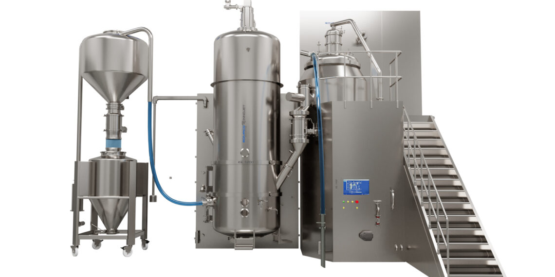 Die Granulierlinien der Serie IGL von Romaco Innojet dienen der Herstellung von hochwertigen Granulaten für die Tablettierung. Das Linienkonzept besteht aus einem High-Shear-Mischer und einem Wirbelschichttrockner mit integrierten Nass- und Trockenmühlen sowie einem angeschlossenen Bulk-Container.