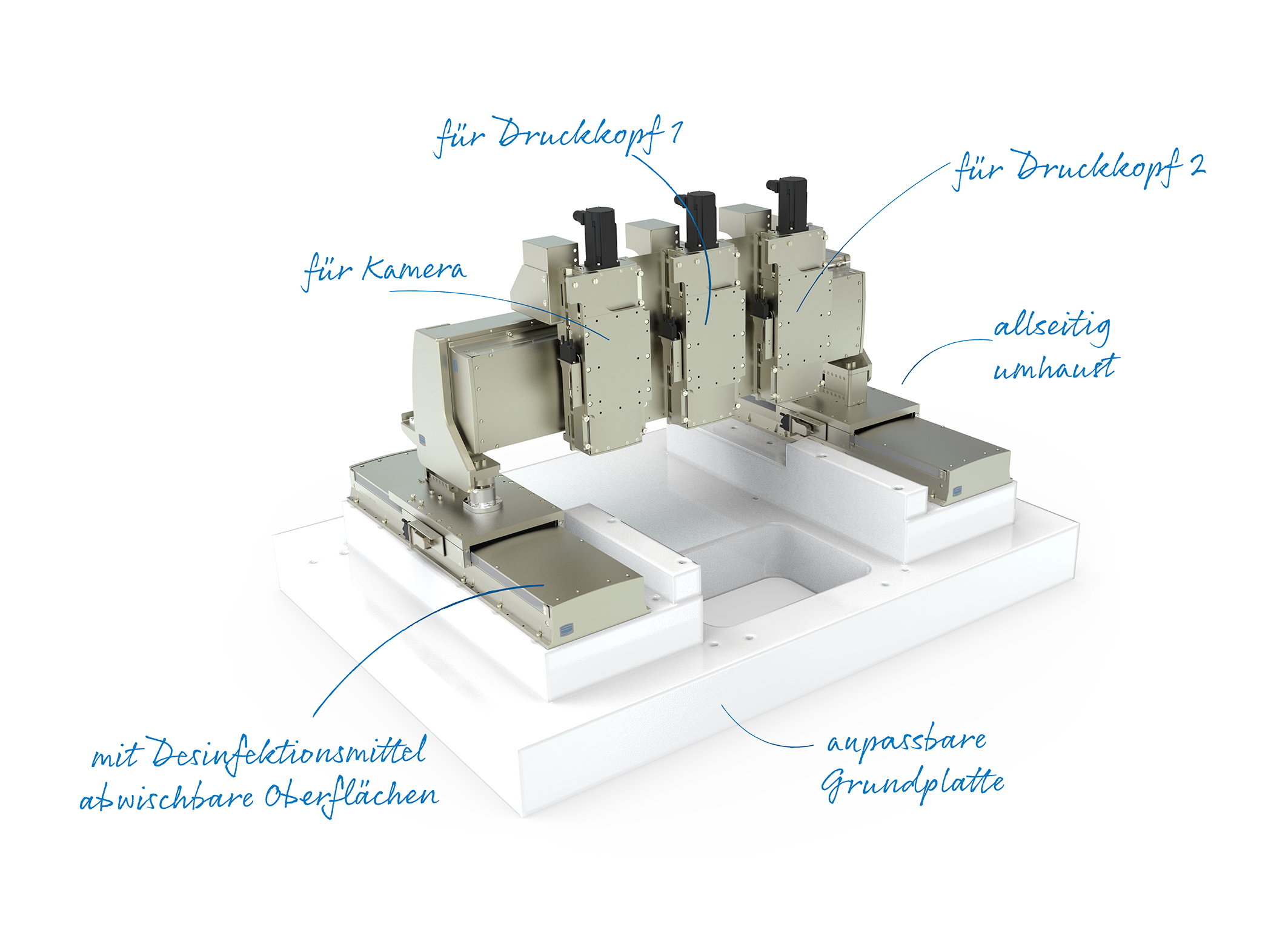 Das Positioniersystem für die pharmazeutische Industrie ist in Achsenanzahl, Baugröße und Antrieb frei konfigurierbar und lässt sich damit an alle Druckaufgaben mit extremem Anspruch an Genauigkeit und Dynamik anpassen. Je nach Last und Stellweg, kommen die PLT-Größenreihen 100, 165, 240 oder 320 zum Einsatz. Für komplexe Druckaufgaben mit mehrfachen Druckköpfen ist das Portal mit multiplen Vertikalachsen konfigurierbar. Die Kabelzuführung, die Medienanschlüsse sowie alle Leitungen und Versorgungsanschlüsse der mitgeführten Sensorik und Druckköpfe sind ebenfalls individuell anpassbar. Auch die Grundplatte, die der automatischen Zuführung und Komplettierung zur Gesamtmaschine dient, wird auf die kundenspezifischen Bedürfnisse zugeschnitten.