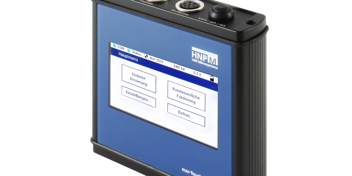 HNP Mikrosys­teme (HNPM) präsen­tiert auf der Com­pamed 2017 mit dem mzr Touch Con­trol eine neue Möglichkeit für die grafis­che Ans­teuerung von Mikrozah­n­ring­pumpen. Die mehrsprachige, grafis­che Bedienober­fläche ergänzt die bish­erige Ans­teuerung von mzr Dosier­pumpen über Lap­top oder PC. Das mzr Touch Con­trol ist ein­set­zbar für die meis­ten mzr Pumpen­größen und bau­rei­hen mit Antrieben geringer bis mit­tlerer Leis­tung. Das kom­pak­te Gerät hat eine ein­fache und intu­itive Benutze­r­ober­fläche und steuert jew­eils eine Pumpe. Mit den Dosier­pumpen, die mit dem mzr Touch Con­trol kom­binier­bar sind, kön­nen Dosier­men­gen ab 0,25 µl und Förder­bere­iche von 1 µl/min bis 288 ml/min durch den Nutzer vorgegeben werden.