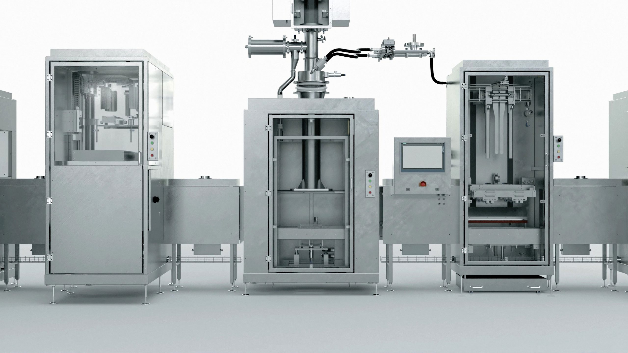 Das Konzept sieht vor, dass das Verwiegungsmodul je nach Gebindegröße mechanisch ausgetauscht werden kann. Eine Waage deckt den Messbereich von 100 Gramm bis 150 Kilogramm ab, eine zweite den Bereich von 500 Gramm bis 1.500 Kilogramm. Beide Wagen sind mit der Wägeelektronik Siwarex WP251 ausgestattet und in dasselbe Bedienterminal integriert. Die Wägemodule sind dabei unabhängig von der zentralen Anlagensteuerung, einer Simatic S7-1500, und ihren Zykluszeiten. Dadurch wird eine besonders hohe Prozessgenauigkeit erreicht. Eine Steuerung Simatic S7-1500 verwaltet unter anderem die Materialparamater und sendet sie mit den definierten Sollwerten an die Wägeelektronik. Inbetriebnahme, Justierung und Betrieb der Wägemodule sind ohne Programmieraufwand einfach über ein Simatic Touch Panel oder Funktionsbausteine in einer Simatic-Steuerung möglich.