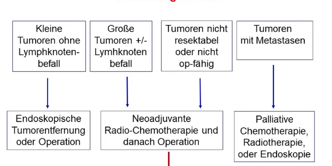 Bei Patien­ten mit Kreb­serkrankun­gen der Speis­eröhre (Ösoph­a­gus) und des oberen Magens bildet sich nicht sel­ten bere­its kurz nach inten­siv­er Behand­lung des erst­mals aufge­taucht­en Tumors ein Rezidiv, also eine erneute Kreb­serkrankung. Bis­lang bestand die Stan­dard­be­hand­lung von Patien­ten mit einem lokal fort­geschrit­te­nen Speis­eröhren- oder oberen Magen-Karzi­nom aus der Kom­bi­na­tion ein­er soge­nan­nten neoad­ju­van­ten, also vor­bere­i­t­en­den, Chemo- und Bestrahlungs­ther­a­pie und ein­er sich daran anschließen­den oper­a­tiv­en Ent­fer­nung des Tumors. Mit dieser Ther­a­piekom­bi­na­tion ist es jedoch nicht gelun­gen, das Risiko eines Rezidi­vs für län­gere Zeit zu verringern.