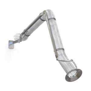 Absaugarm in smarter, stilechter Kon­struk­tion, vor­rangig für Indus­triebranchen mit hohen Hygie­n­ean­forderun­gen, wie zum Beispiel der Lebens­mit­tel- und Phar­main­dus­trie. Das kom­plette Ober­flächen-Fin­ish beste­ht aus hochglanzpoliertem säurebeständi­gem Edel­stahl, und der anti­s­ta­tis­che Schlauch ist mit Schnel­lver­schlüssen ange­bracht, was den PSS zu einem leicht zu reini­gen­den Absaugarm macht.