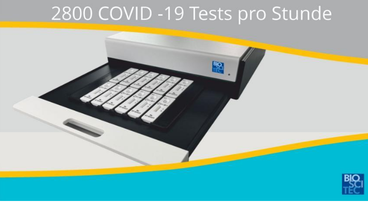 Die BioSciTec GmbH verfügt über leicht zu skalierende Systeme und kann so, in Zeiten hohen Testaufkommens, schnell reagieren und die Anzahl der Auswertungen hochfahren. Die Auswertesysteme eignen sich hervorragend zur Auswertung von COVID-19 Schnelltests. Die Einsatzgebiete sind hauptsächlich Schnelltestzentren und Einlass-Testungen von Mitarbeitern für die Industrie und im Gesundheitswesen.