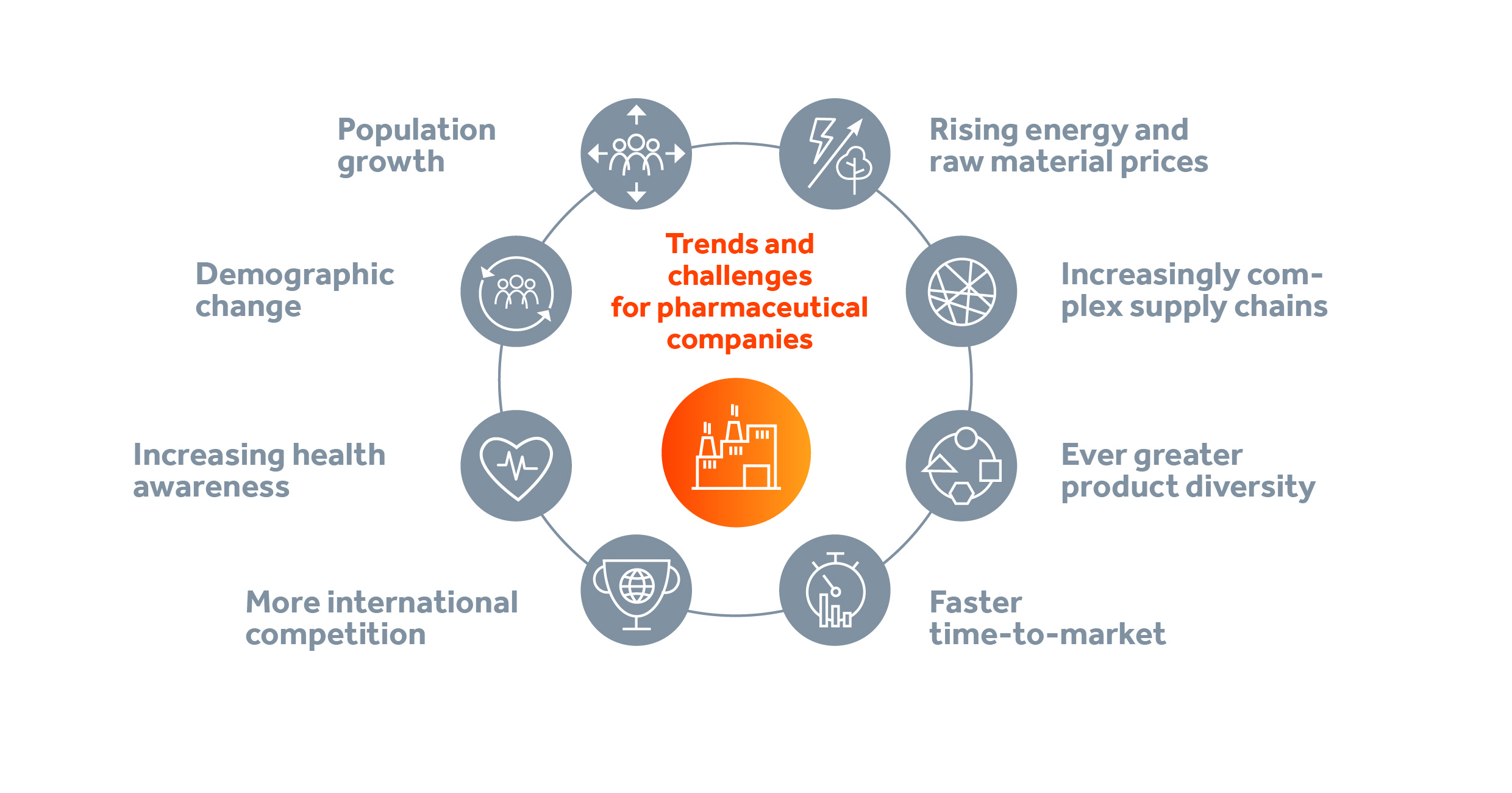 Die Phar­ma- und Health­care-Branche zählt zu den größten und dynamis­chsten Wach­s­tumsmärk­ten weltweit. Das hat unter­schiedliche Gründe, etwa eine rapi­de wach­sende Welt­bevölkerung und der demografis­che Wan­del hin zu immer älteren Gesellschaften. Dadurch steigt die Nach­frage nach Medika­menten und anderen phar­mazeutis­chen Pro­duk­ten. Für die meis­ten Pharma­her­steller ist das Mark­tum­feld jedoch auch deut­lich volatil­er gewor­den – bed­ingt durch zunehmenden inter­na­tionalen Wet­tbe­werb, neue Ther­a­pie- und Dar­re­ichungs­for­men sowie den Trend zu mehr Indi­vid­u­al­isierung. Darüber hin­aus sinkt die soge­nan­nte Time-to-Mar­ket, das heißt: Immer mehr Pro­duk­te kom­men in immer kürz­er­er Zeit auf den Markt.