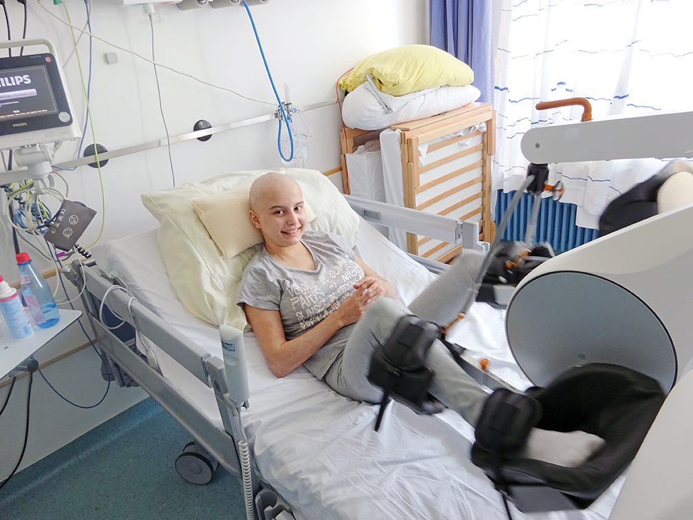 Ein jugendlich­er Patient befand sich vor drei Jahren mit ein­er leukämis­chen Erkrankung und Ver­lust der Gehfähigkeit in Behand­lung im Uni­ver­sität­sklinikum Tübin­gen. Neben Schmerzen im Bere­ich der Füße und den Unter­schenkeln fehlte ihm die Kraft in den Beinen, um sowohl Ste­hen als auch Gehen zu kön­nen. Gemein­sames Ziel war, das Gehen wieder zu erler­nen. Der Patient begann neben der täglichen Phys­io­ther­a­pie mit einem geliehen Bet­tfahrrad zu trainieren. Im Ver­lauf wur­den die Schmerzen weniger. Die Kraft nahm stetig zu. Alle fieberten mit und motivierten ihn. Schließlich gelang es, dass er an einem hohen Gehwa­gen gestützt die ersten Schritte gehen kon­nte – ein Meilenstein!