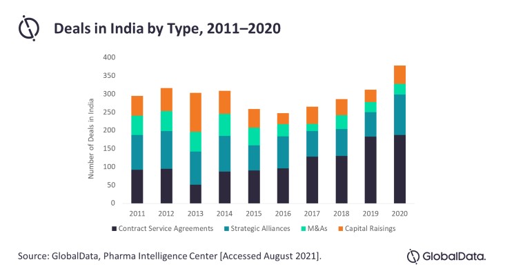 “Contract Service Agreements (CSAs), die beliebteste unter den Geschäftsarten in Indien, verzeichneten einen starken Anstieg der Anzahl — von 130 Vereinbarungen im Jahr 2018 auf 183 im Jahr 2019 — und behielten ihr erhöhtes Niveau auch im nächsten Jahr bei. Der Anstieg der COVID-19-Fälle im Jahr 2020 veranlasste große Pharmaunternehmen dazu, Verträge zur Auslagerung der klinischen Forschung und Herstellung von antiviralen Therapeutika und Impfstoffen abzuschließen. Als weltweit größter Impfstoffhersteller war Indien ein optimaler Markt für diese Vereinbarungen. CSAs waren jedoch nicht die einzige Art von Verträgen, die aufgrund der Pandemie einen Aufwärtstrend verzeichneten; strategische Allianzen, einschließlich Lizenzvereinbarungen und Partnerschaften, nahmen von 2019 bis 2020 um 40 % zu. Die meisten dieser Verträge (30 %) konzentrierten sich auf COVID-19.”