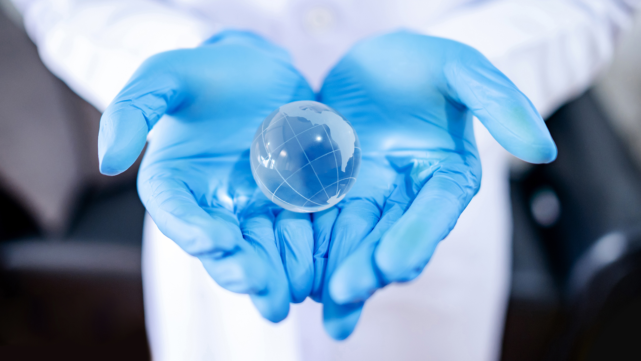 Global health and medicine. Heal the world concept. Doctor, nurse or medical worker in white protective suit with blue sterile rubber gloves holding world globe crystal glass ball in hand.