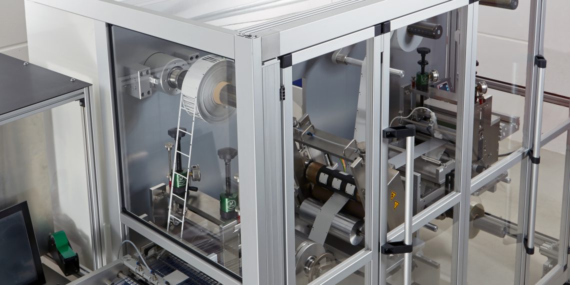 Eine Schutzeinhausung von RK Rose+Krieger mit verschiebbaren Falttüren und Acrylglasflächen sorgt bei der Produktion von Pharmazeutika für optimale Zugänglichkeit und Hygiene ohne die Maschine dabei zu verdunkeln.