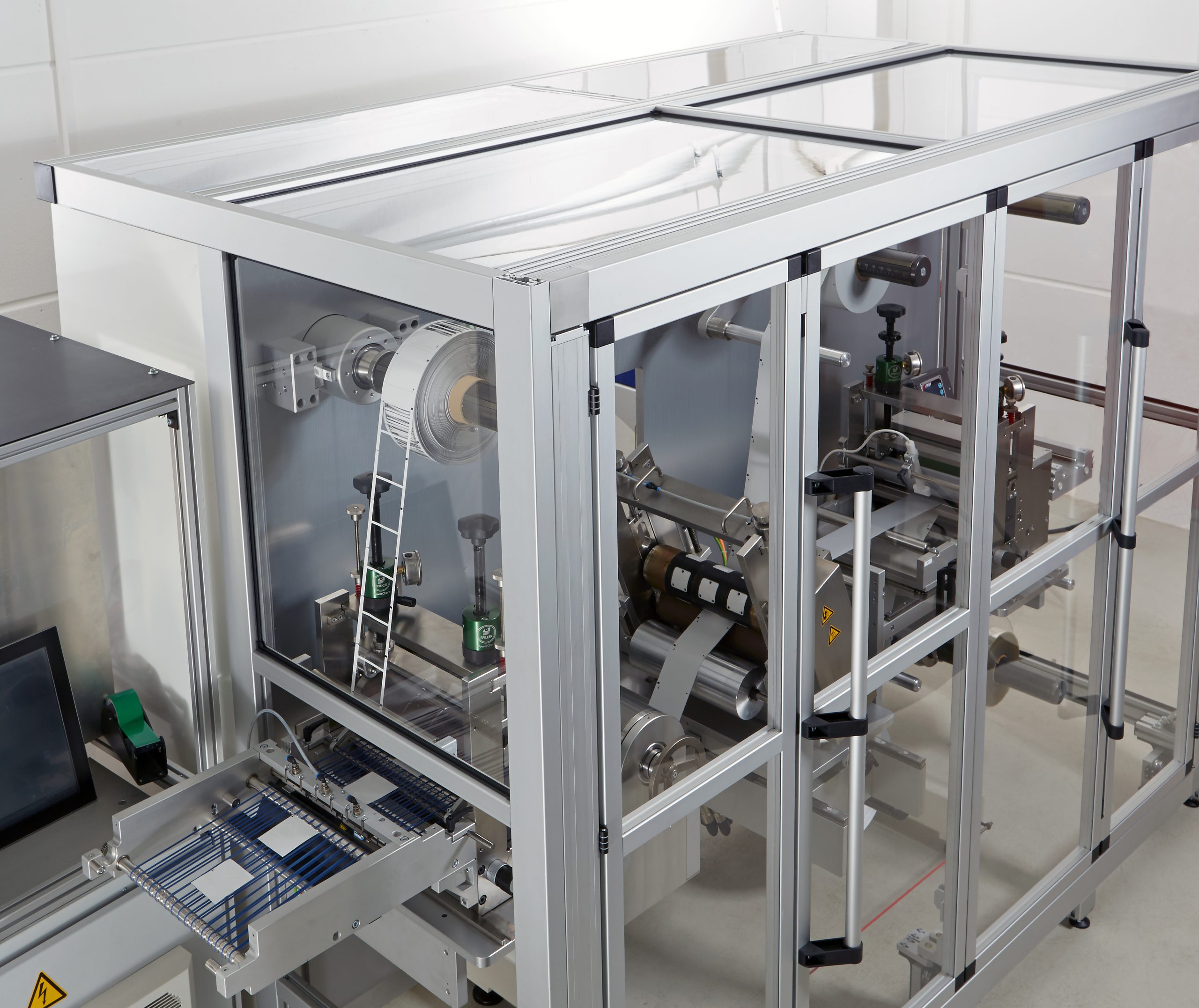 Für die Produktion von Schmerzpflastern konzipierte Spilker eine Rotationsmaschine, die unterschiedliche Spende‑, Stanz- und Laminierprozesse mit dem Vorgang des rotativen Siegelns kombiniert. Dabei werden die von einer Rolle einlaufenden Pflaster zunächst vereinzelt und mit einem Einschnitt zum leichteren Öffnen der einzelnen Pflaster versehen. Anschließend erfolgt die luftdichte verpackung der Einzelpflaster durch das Versiegeln. Ein essentieller Teil der Anlage sollte eine Schutzeinhausung werden, die die Einhaltung der zahlreichen Vorschriften garantieren würde und gleichzeitig zentrale Kundenwünsche nach einer problemlosen Zugänglichkeit über die gesamte Maschinenlänge und einem hohem Lichteinfall erfüllen musste.