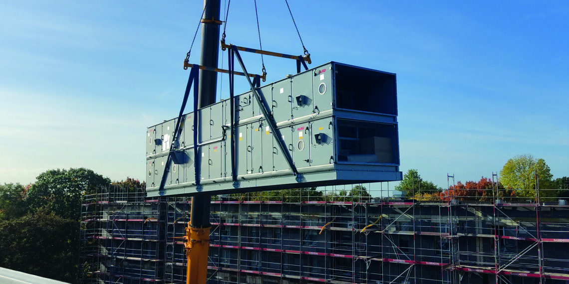 Neben großen Gerätausführungen mit Luftmengen bis zu 150.000 Kubikmeter bietet AL-KO Air Technology das AT4 auf Kundenwunsch auch als Plug & Play-Lösung an. Fertig montiert auf einem Grundrahmen und mit befüllten Systemen repräsentiert das AT4 Complete einen hohen Grad an industrieller Vorfertigung. Diese reduziert die Schnittstellen, beschleunigt die Installation sowie die Inbetriebnahme und spart schließlich Zeit und Ressourcen auf der Baustelle. Und nicht zuletzt kommt das Gerät mit einem Hub per Kran auf das Dach, sofern gewünscht.