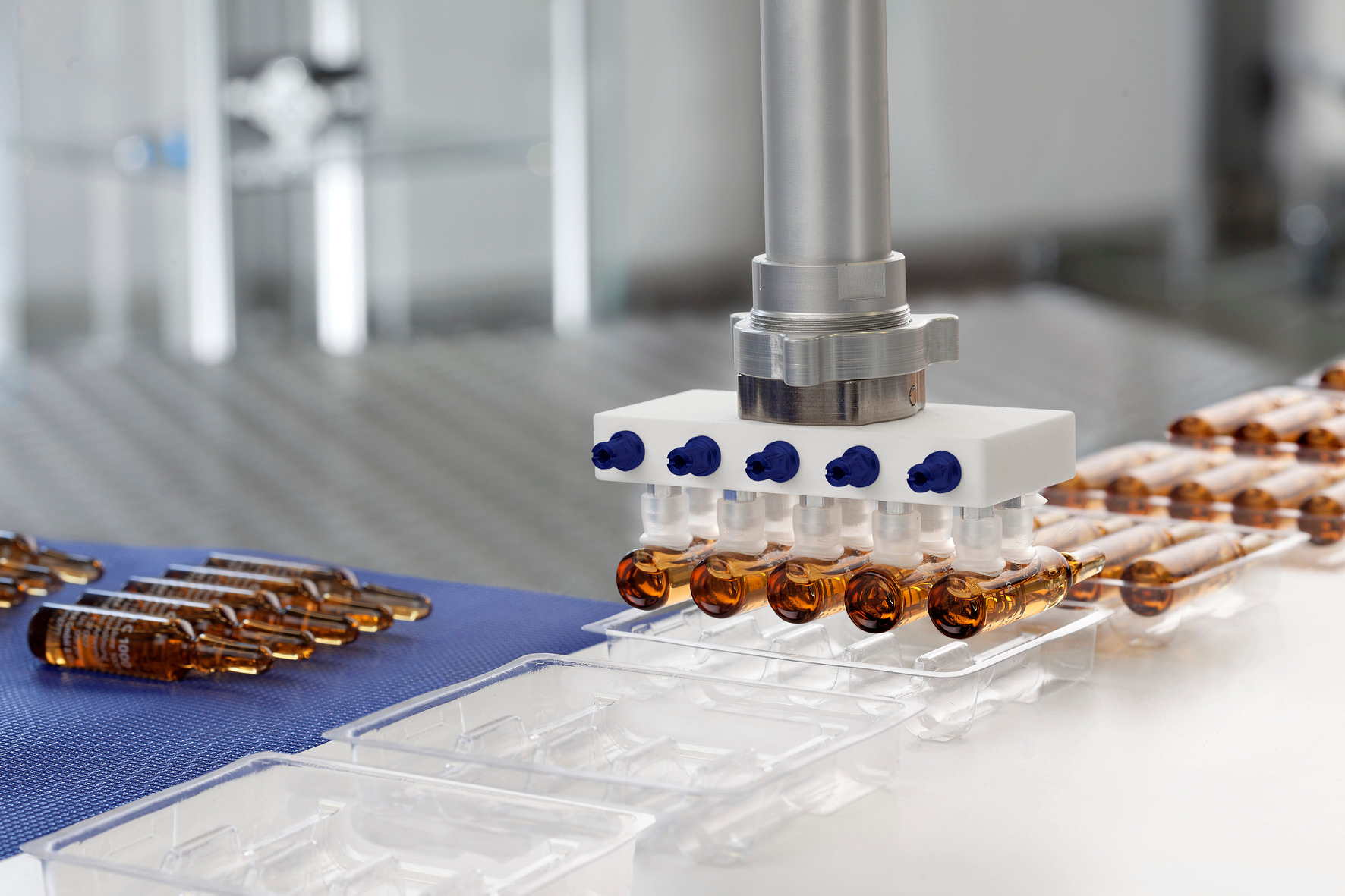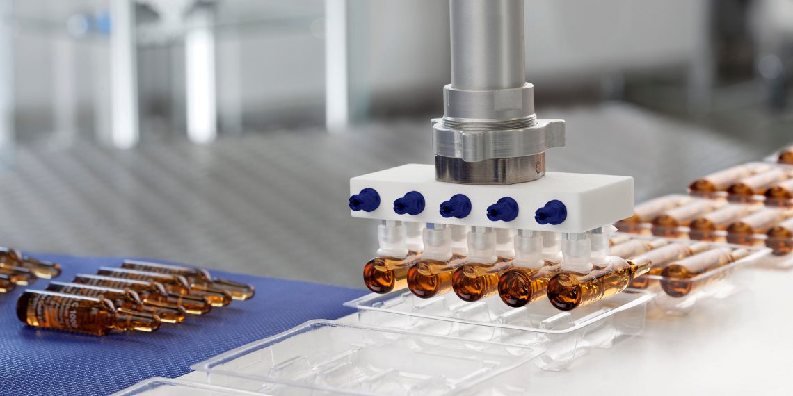 „Für Blister, Ampullen, Spritzen oder Injektionsfläschchen bieten wir Sauggreifer mit kleinen Durchmessern. Unsere Greifer können zum Beispiel kleine Glasgefäße mit Impfstoff äußerst schonend und kontaminationsfrei greifen. Im Logistikzentrum bewegt oft ein Mitarbeiter sehr viele dieser Pakete manuell und in hoher Taktzahl. Über den Tag verteilt trägt er so Lasten von mehreren 100 Kilogramm.“