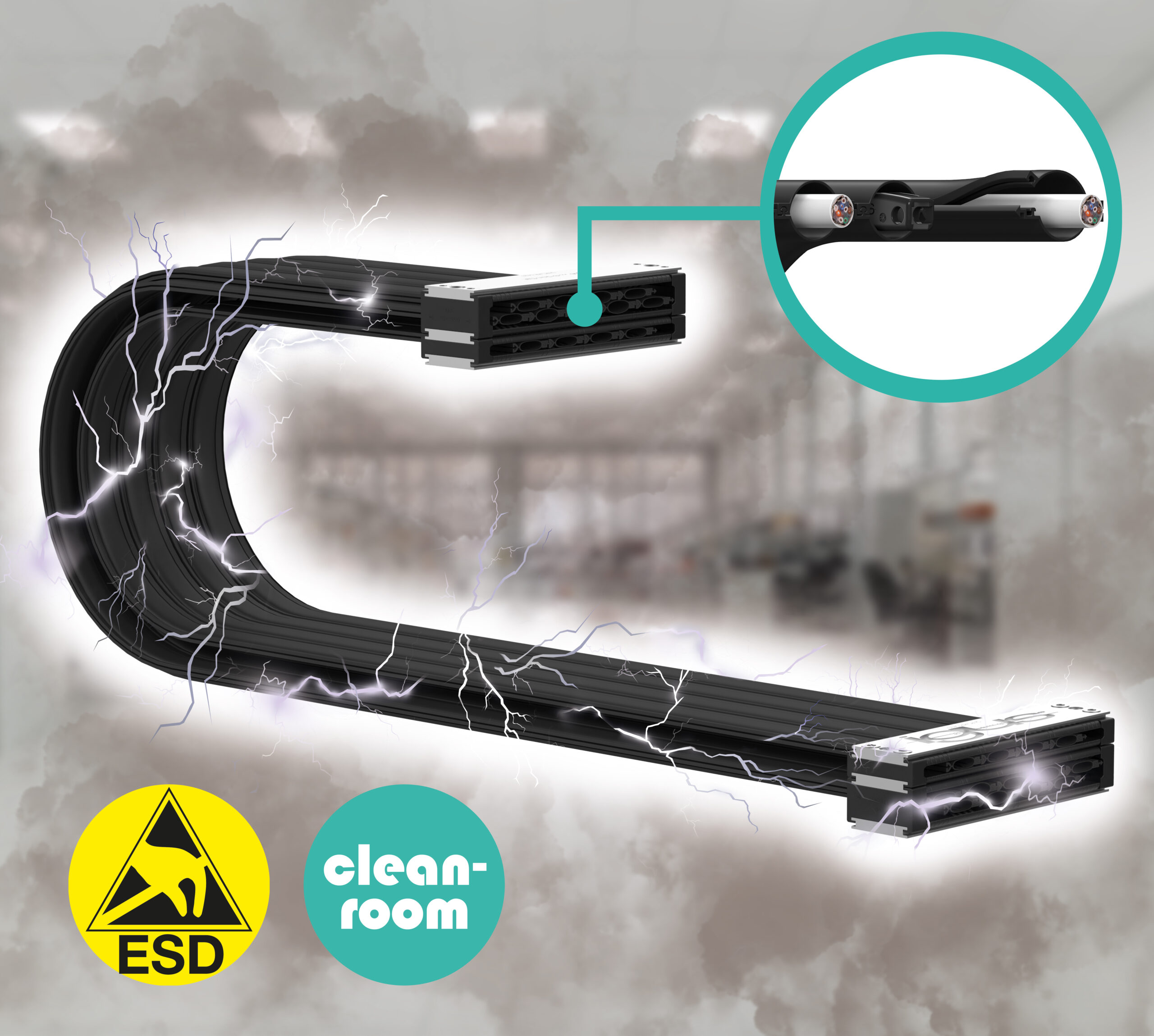Speziell für hochsensible Reinräume hat igus seine e‑skin flat Serie um eine ESD-Variante erweitert. Der neue Werkstoff des modularen Flachbandkabels verhindert eine elektrostatische Aufladung der Kette und sorgt gleichzeitig für Partikelfreiheit, selbst bei schnellsten Bewegungen. Gleichzeitig ermöglicht der modulare Aufbau mit einzelnen Pods eine schnelle Befüllung der Energieführung.