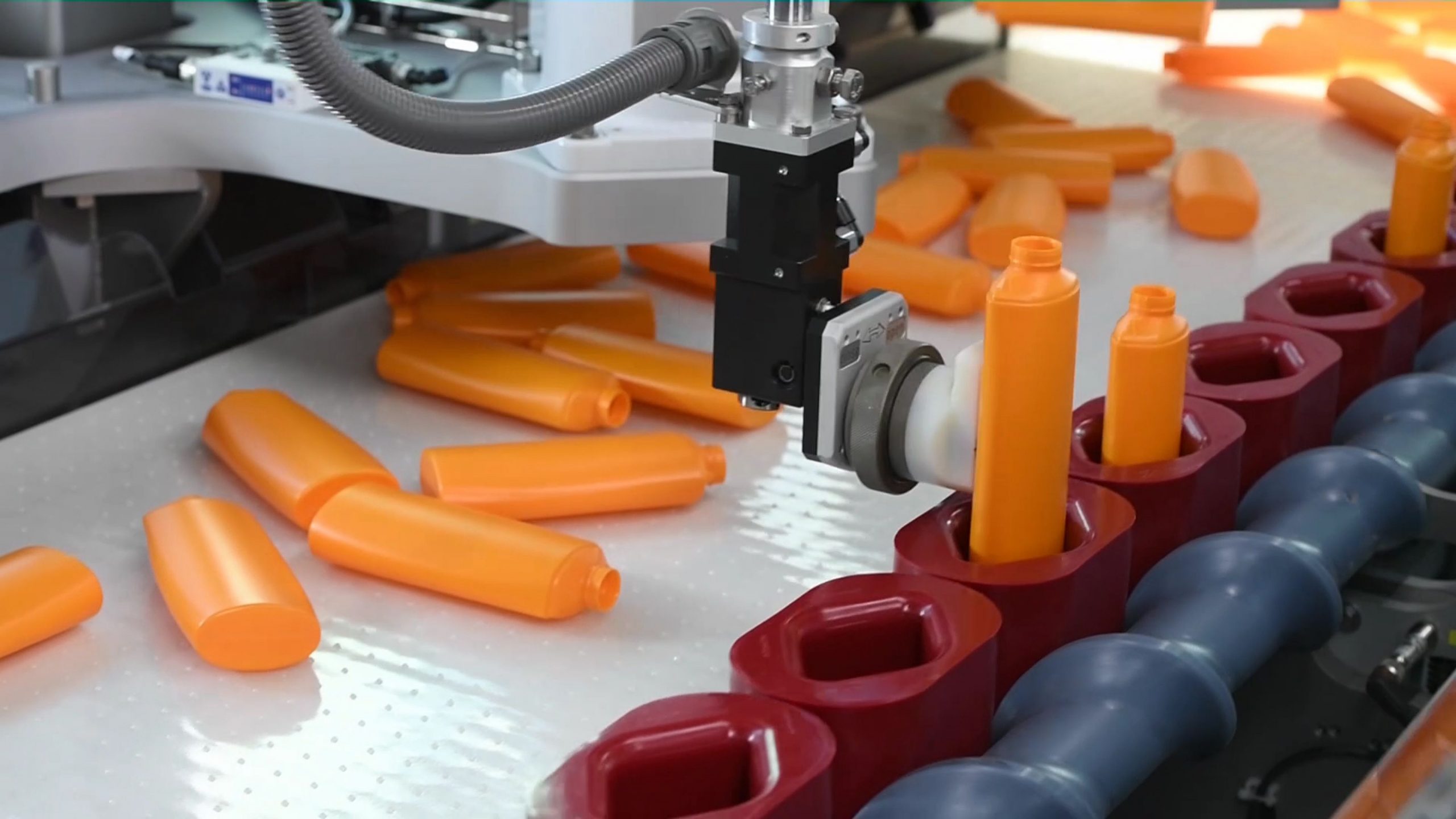 „Flaschenhandlingsysteme bilden den ersten Schritt in der Befüllungsprozesskette“, erklärt Michael Musat, Vertriebsingenieur bei Rationator Maschinenbau. „Gleichzeitig sind sie besonders wichtig, weil die Präzision und Geschwindigkeit zu Beginn der Abfertigung darüber entscheidet, wie viel Durchsatz am Ende möglich ist.“ Um dem steigenden Wettbewerbsdruck in der Kosmetikbranche zu begegnen, entwickelte Rationator daher seinen Flaschenaufstellautomat Bottlemat Robot dahingehend weiter, dass nicht wie bisher zwei oder drei Vakuumgreifer die Flaschen vom Band aufnehmen und in die Ratilight Pucks einsetzen, sondern vier. Durch den zusätzlichen Greifer kann der Bottlemat Robot nun statt vormals maximal 140 Flaschen bis zu 165 Flaschen pro Minute aufstellen und für den Abfüllvorgang weiterleiten.