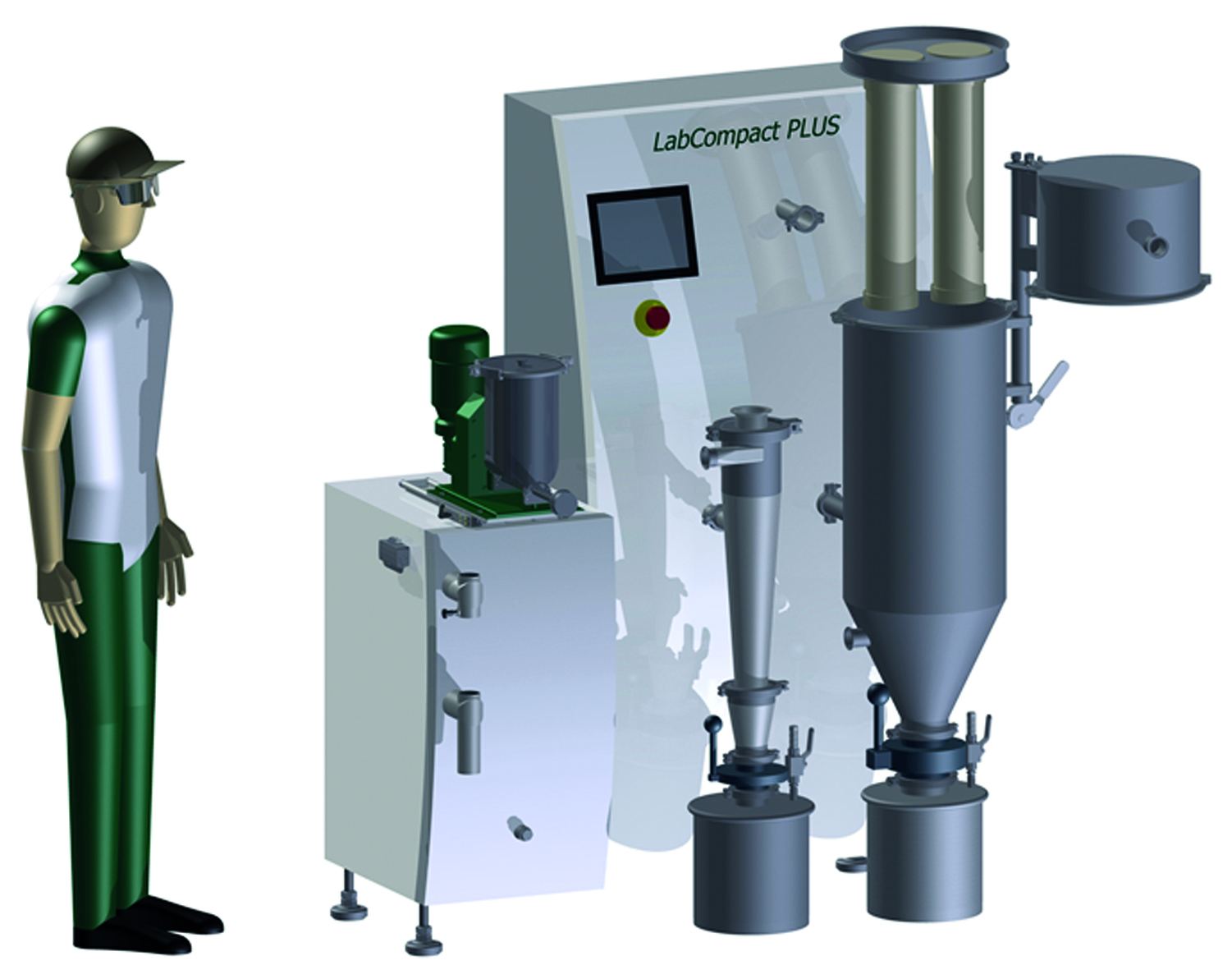 Neben der eigentlichen Vermahlung bzw. Sichtung besteht die Anlage aus einem äußerst kompakten Betriebsmodul, in dem Dosierung, Zyklon, Filter, Gebläse und elektrische Steuerung zusammengefasst sind. Hier wird das Material über eine Dosierschnecke direkt in die Maschine aufgegeben und dort verarbeitet. Im nachgeschalteten Hochleistungszyklon wird das Feingut abgeschieden und in ein Produktfass abgefüllt, wobei ein nachgeschalteter vollautomatischer Staubfilter die kontinuierliche Reinigung der Prozessluft übernimmt. Die durchdachte Bauweise gewährleistet nicht nur eine besonders nutzerfreundliche Bedienung sowie einfache Reinigung und Wartung, sie stellt außerdem sicher, dass die LabCompactPlus auch bei schwierigen Platzverhältnissen aufgestellt werden kann. Bemerkenswert ist darüber hinaus, dass die komplette Anlage auf einem gemeinsamen Grundrahmen montiert und fertig installiert ausgeliefert wird. Sie kann somit beim Kunden vor Ort unmittelbar in Betrieb genommen werden.