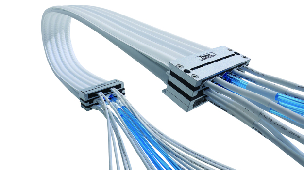 Das Flachk­a­bel­sys­tem ist abriebfest und vibra­tionsarm und hält so die Anzahl der luft­ge­tra­ge­nen Par­tikel auf einem Min­i­mum. Der Her­steller arbeit­et mit Werk­stof­fen, die einen niedri­gen Rei­bungsko­ef­fizien­ten aufweisen. Die Kom­bi­na­tion von hochver­schleißfesten Kabeln, Schläuchen und Trägerele­menten gewährleis­tet eine geringe Stauben­twick­lung und eine ver­längerte Lebensdauer.