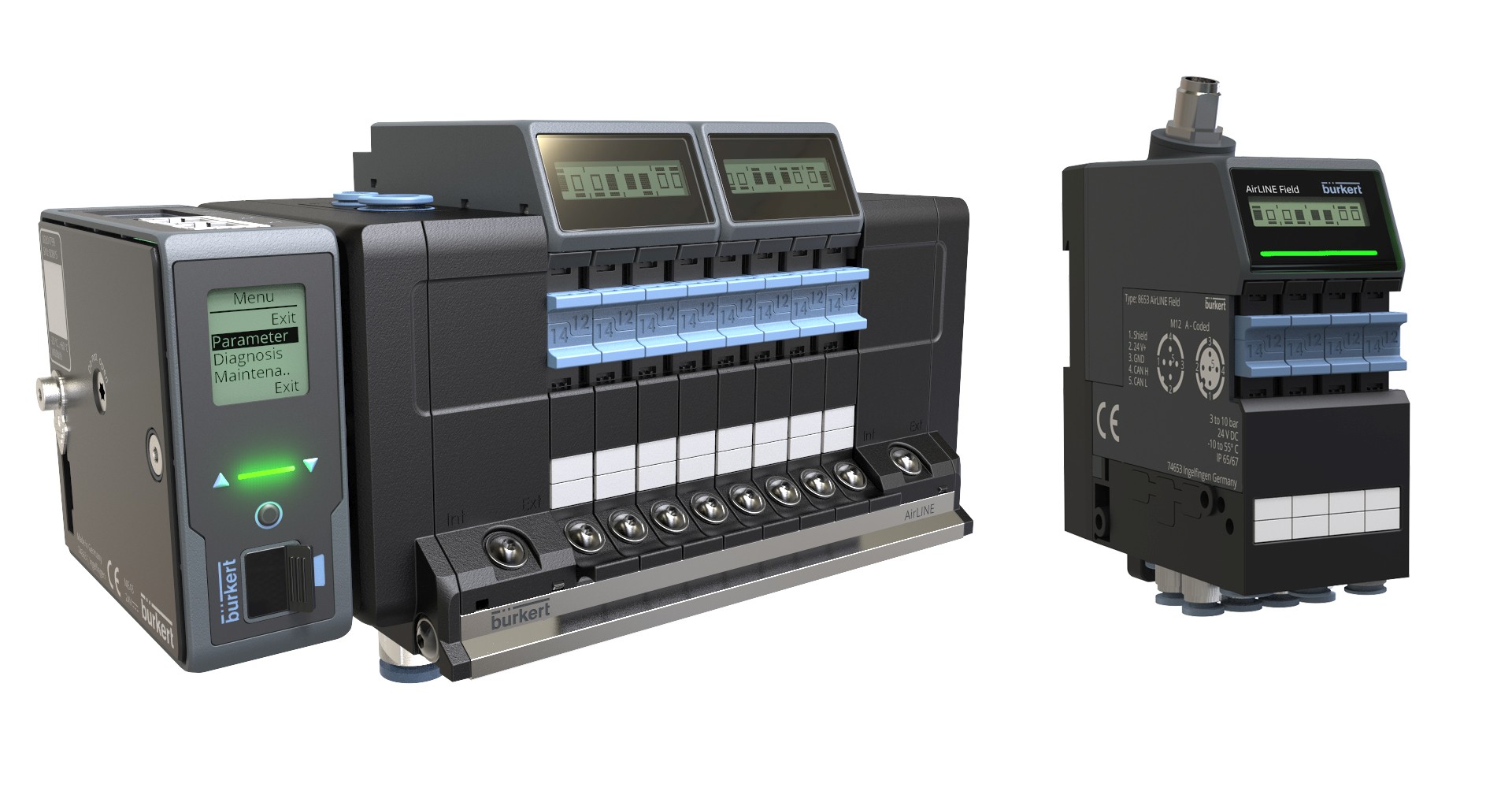Die Ven­tilin­seln wur­den für Anwen­dun­gen in Pharma‑, Kosmetik‑, Nahrungs- und Genuss­mit­telin­dus­trie sowie für die Wasser­auf­bere­itung konzip­iert. Sie bieten den Nutzern ein­stell­bare Überwachungs- und Diag­nose­funk­tio­nen, die die Anla­gen­ver­füg­barkeit und Prozess­sicher­heit verbessern und eine vor­beu­gende Wartung ermöglichen. Ein inte­gri­ertes Dis­play zeigt dafür vor Ort detail­lierte Infor­ma­tio­nen wie aktuelle Schaltzustände von Pilotven­til und Prozessven­til an, gibt eine Mel­dung, wenn vor­eingestellte Druck­gren­zw­erte über­schrit­ten wer­den oder zeigt in Klar­text Fehler wie Kabel­bruch an. Beson­deres Augen­merk wurde bei der Entwick­lung auch auf die kom­pak­te Bau­form gelegt. Die Ven­tilin­sel Typ 8652 ist deut­lich klein­er als ihr Vorgänger und find­et somit in kom­pak­ten Schaltschränken Platz, die nahe an den Prozessven­tilen platziert wer­den können.