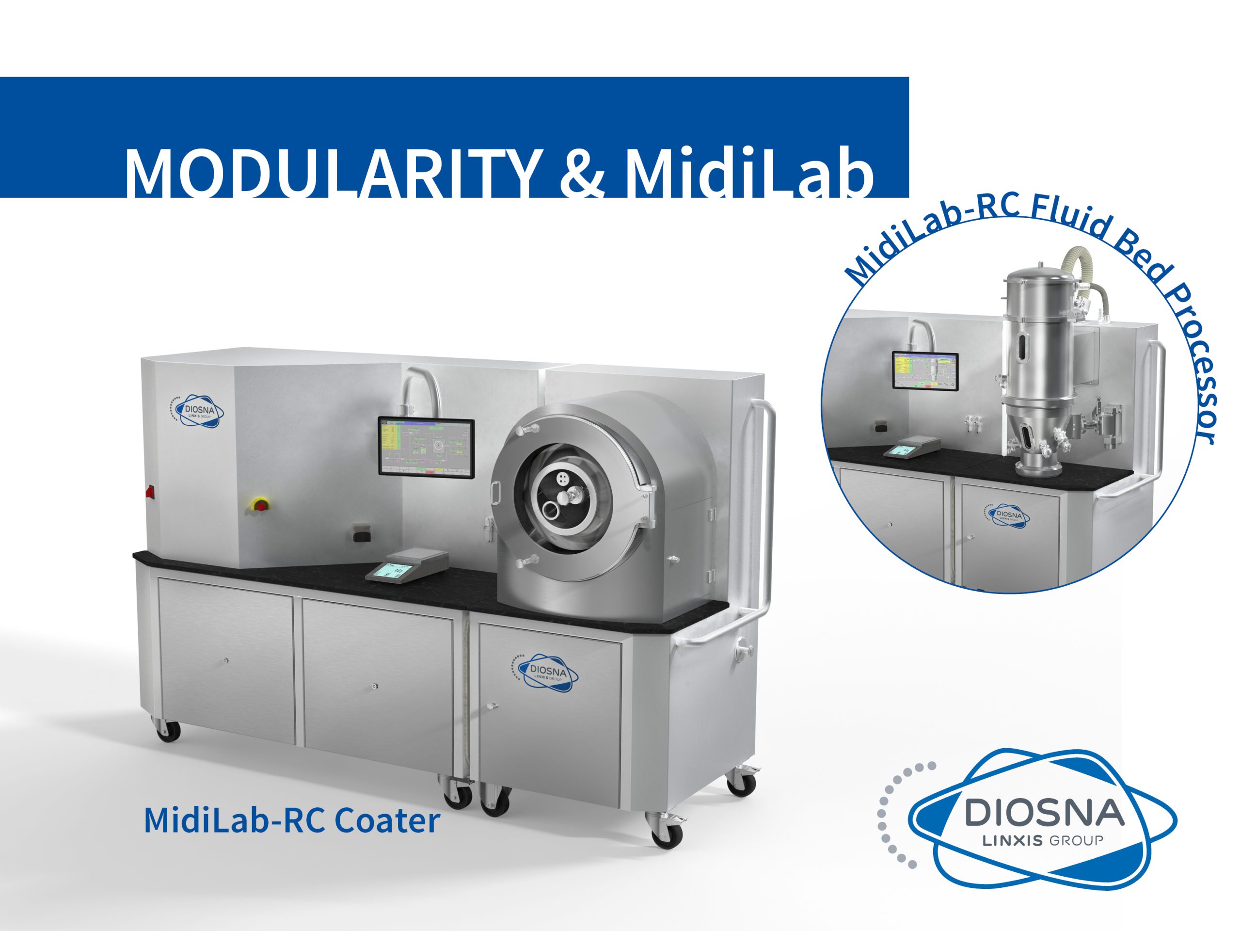 Genau hier zeigt die neue Laboranlage Midilab RC der Firma Diosna Dierks & Söhne GmbH ihre Stärken. Sie besitzt, wie auch die kleinere Ausführung Minilab RC, einen modularen Aufbau, der das einfache Wechseln zwischen einem Wirbelschicht- und einem Tabletten-Coater-Modul ermöglicht. Durch die Verwendung von unterschiedlichen Behältergrößen kann die Batchgröße bei beiden Verfahren ideal an den Prozess angepasst werden. Ein schwenk- und kippbares Bedienterminal mit Edelstahlgehäuse ermöglicht dem Benutzer das Bedienterminal immer entsprechend den Anforderungen einzustellen. Die Basiseinheit des Midilab RC umfasst die Luft‑, Mess- und Regeltechnik, die für alle Komponenten notwendig ist. Zudem bietet die Arbeitsfläche Platz zum Ansetzen von Granulier- und Coatingflüssigkeiten sowie zum Abstellen einer Waage oder anderem Zubehör.