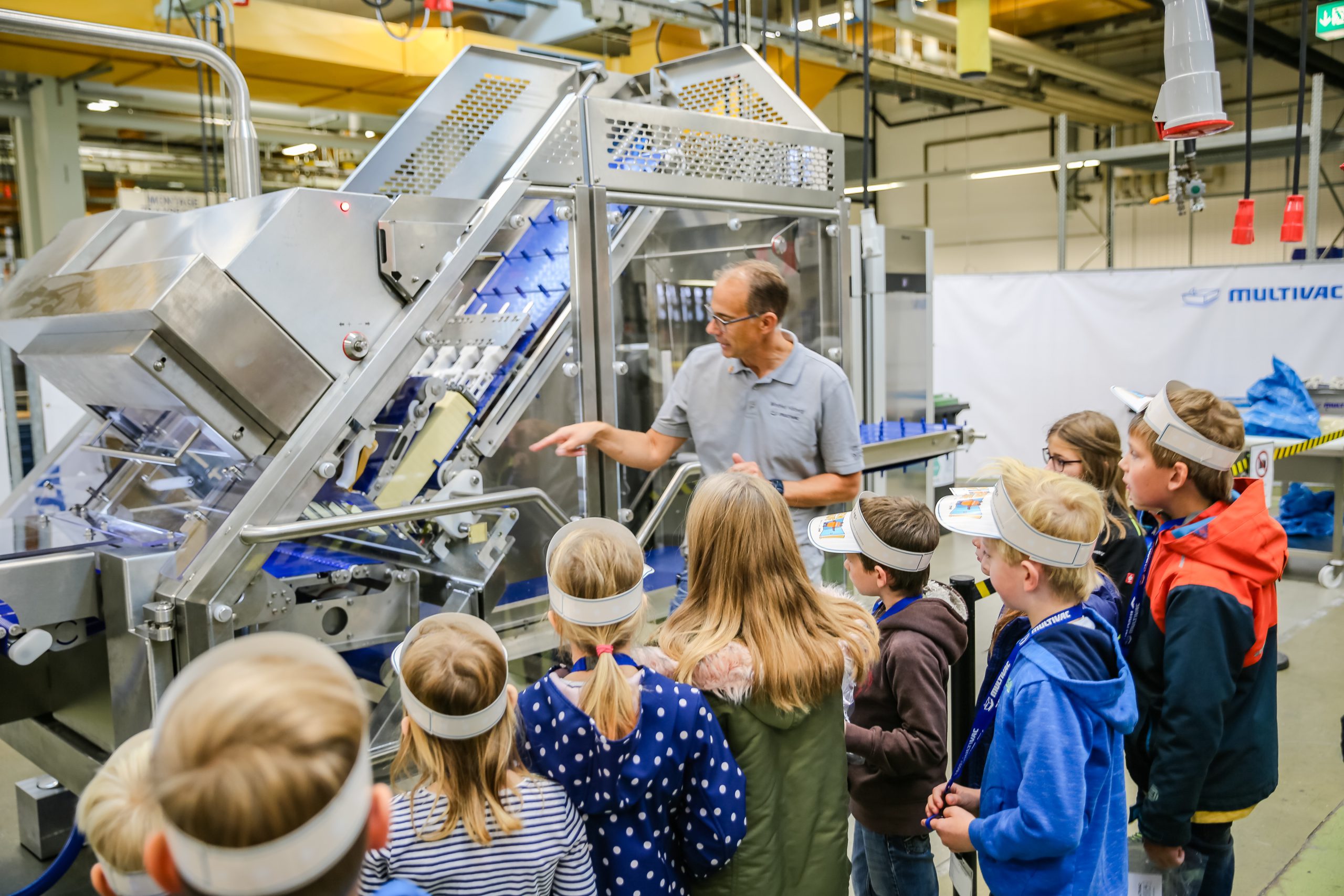 Die Teilnehmer nahmen verschiedene Verpackungen unter die Lupe, die ihnen im Alltag begegnen. Unter Anleitung des Multivac Teams lernten sie, wie eine Verpackung hergestellt wird, was Vakuum ist und warum es manchmal beim Öffnen einer Verpackung leise zischt. Besonders spannend fanden es die Kinder zu erfahren, wie sich aus einem Käseblock einzelne Käsescheiben automatisiert schneiden und verpacken lassen – in einer Verpackung, die man im Supermarkt kaufen kann. Hierzu demonstrierte das Multivac Team eine komplette Verpackungslinie im Live-Betrieb, die aus einem Slicer, einem Einleger und einer Tiefziehverpackungsmaschine bestand. Schließlich durften die Teilnehmer selbst kleine Spielzeug-Tiere und Magnete in Maus-Form, die sie anschließend mit nach Hause nehmen konnten, auf verschiedenen Verpackungsmaschinen verpacken.