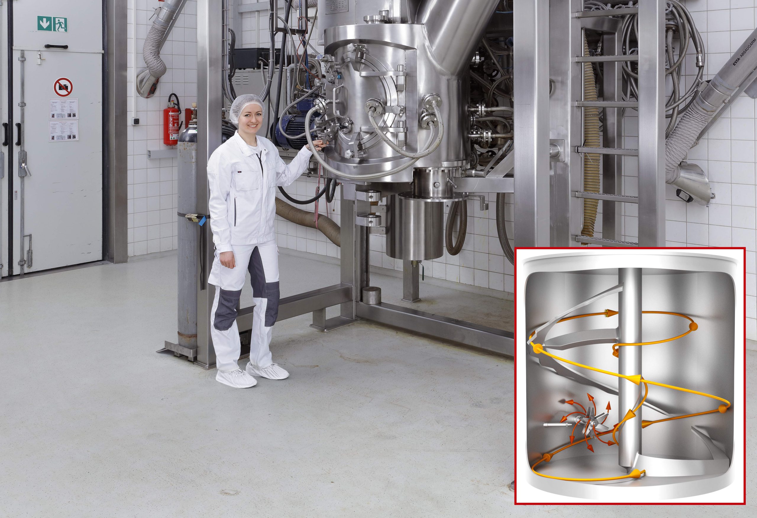 Das Arbeitsvolumen VMT 2000 Apparates kann ungefähr zwischen 400 Liter und 2000 Liter variieren. Gleich-ermaßen sind ideale Mischgüten bei Füllgraden zwischen 20 Prozent und 100 Prozent erzielbar. Ein doppelmanteliges, helixartiges Schraubenband-Mischwerk verströmt die Mischgüter bei minimaler Energieeintragung. So fließen die Mischgüter in der Peripherie des Mischraumes aufwärts und strömen im Zentrum abwärts. Da der Mischeffekt in Form einer Totalverströmung unabhängig von der Drehfrequenz gleichermaßen stattfindet, können auch empfindliche Güter und deflagrationsgefährdete Komponenten am Reaktions- oder Trocknungsprozess beteiligt sein, ebenso wie leicht brennbare und staubexplosive Güter. Die Umfangsgeschwindigkeit des Mischwerk-zeuges beträgt dann beispielsweise nur 0,8 Meter pro Sekunde, kann aber im Fall unkritischer Mischgüter bis auf vier oder fünf Meter pro Sekunde erhöht werden.