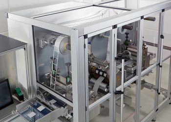 Eine Schutzeinhausung von RK Rose+Krieger mit verschiebbaren Falttüren und Acrylglasflächen sorgt bei der Produktion von Pharmazeutika für optimale Zugänglichkeit und...