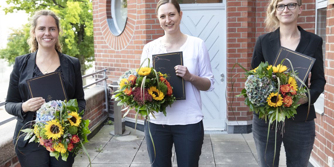 Am Montag hat der Exzellenzcluster „Precision Medicine in Chronic Inflammation“ (PMI) drei Dorothea-Erxleben-Forscherinnenpreise an herausragende junge Wissenschaftlerinnen auf dem Gebiet der Entzündungsforschung vergeben. Die in diesem Jahr ausgezeichneten Forscherinnen werden mit einmal 100.000 Euro und je zweimal 50.000 Euro gefördert. Die Präsidentin der Christian-Albrechts-Universität zu Kiel (CAU), Professorin Simone Fulda, und ihre Amtskollegin Professorin Gabriele Gillessen-Kaesbach von der Universität zu Lübeck (UzL) übergaben die Auszeichnungen an die Preisträgerinnen Professorin Petra Bacher (CAU), Dr. Corinna Bang (CAU) und Dr. Julia Pagel (UzL).