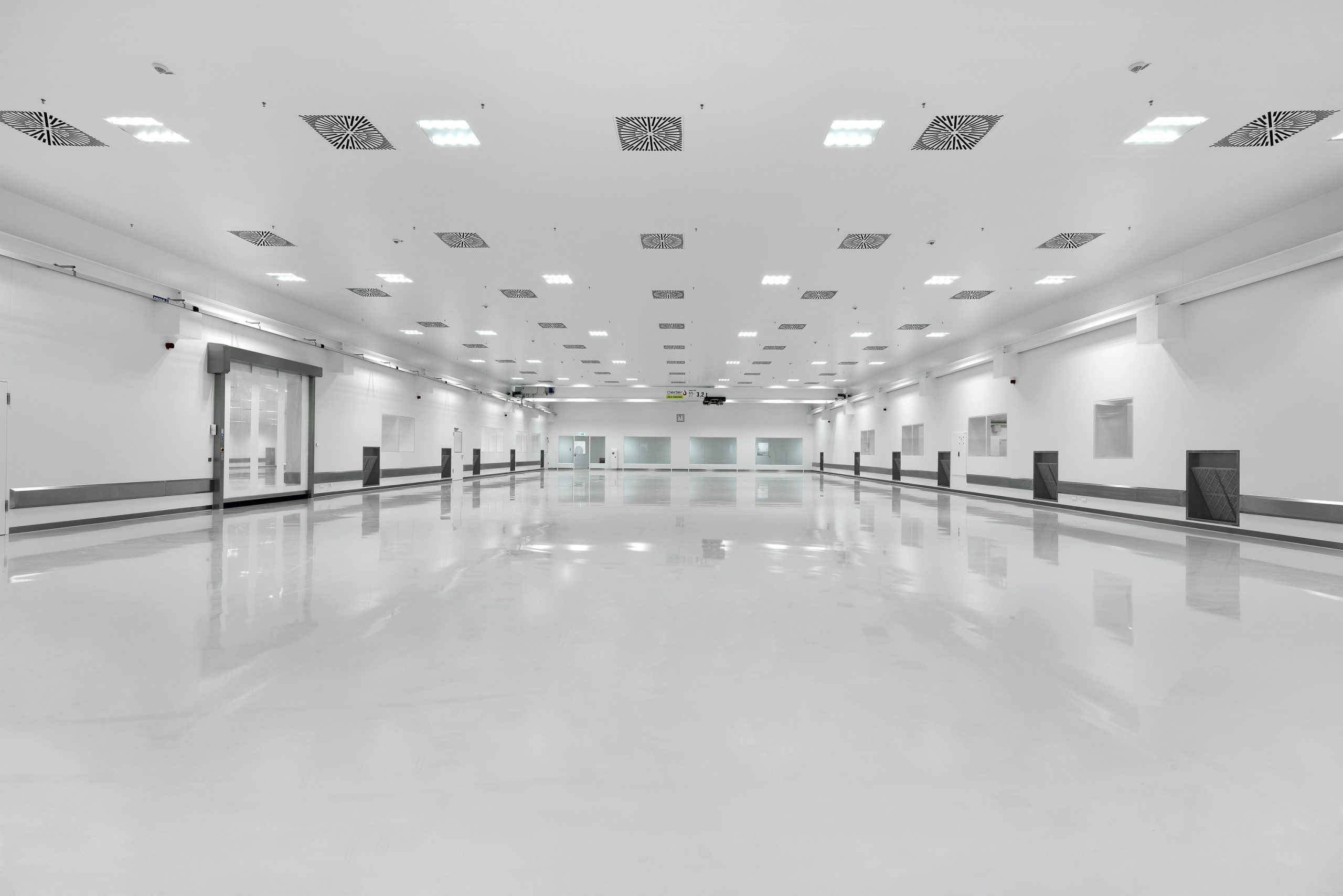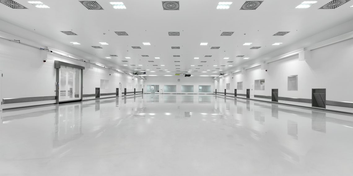 Die großflächigen Reinräume sind durch integrierte Ganzglaselemente einsehbar und verbinden so optisch die Reinraum-Arbeitsbereiche mit den angrenzenden Flurbereichen, die zu den Laboren und zur Qualitätssicherung führen. Insgesamt verbaute das Unternehmen ca. 900 m² Reinraumwandsysteme in Schalenbauweise vom Typ Logic 100, wovon viele Teilabschnitte als überbreite Doppelständerkonstruktion installiert wurden. Um die Rückluftschächte dabei optimal zu integrieren, wählte man hier eine Wandstärke von 700 mm. Die damit verbundenen Rückluftgitter mit integrierten Filtern sind besonders revisionsfreundlich und werkzeuglos zu öffnen. Ein durchgängiger Rammschutz aus Edelstahl bewahrt vor etwaigen Wandbeschädigungen. Im Zugangs- bzw. Durchgangsbereich integrierte man Schnelllauftore und automatische Schleusensteuerungen für Personal und Material. Die Materialdurchreichen seitlich der Reinräume wurden mit integrierten Filter Fan Units (FFUs) ausgestattet.