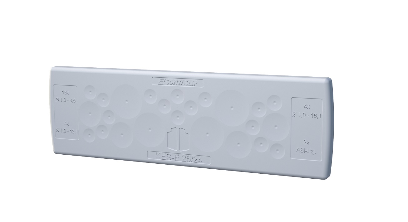 Conta-Clip ergänzt sein KES Kabeleinführungen mit der schraubenlos montierbare Variante KES‑E. Ohne aufwendige Kabelverschraubungen ermöglichen die Kabeleinführungsplatten die schnelle und sichere Einführung nichtkonfektionierter Leitungen und Schläuche in Schaltschränke und Maschinengehäuse. Dank der umlaufenden Profildichtung erfolgt die Installation der Kabeleinführungen ohne Werkzeugeinsatz, indem sie einfach in die erforderlichen, 36 x 112 Millimeter großen Standardöffnungen der Gehäusewand gedrückt werden. Die innere, elastische Lippe der Profildichtung wölbt sich hierbei hinter die Innenseite des Gehäuses und sorgt für einen sicheren Halt. Die Einführungsplatten eignen sich für Wandstärken von 1,5 bis 2,5 Millimeter.