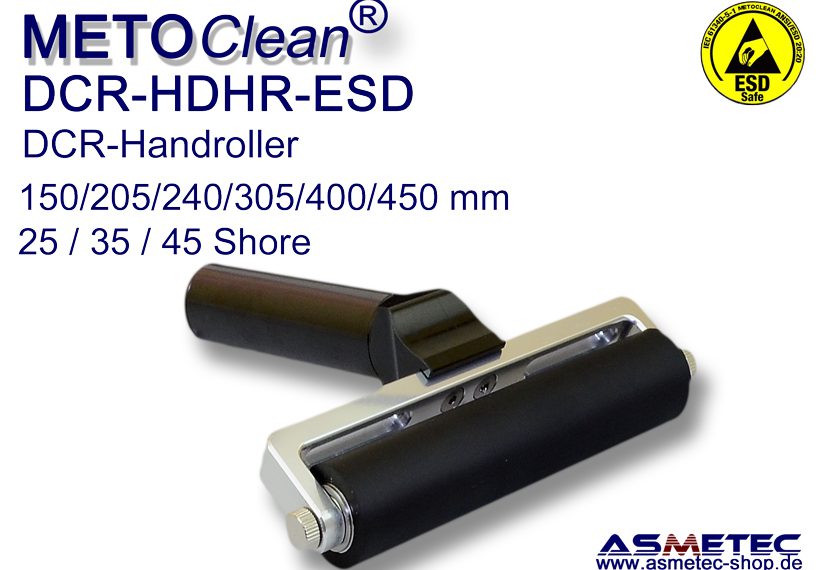 The METOCLEAN-DTS-HDHR hand rollers are available in the widths 150, 205, 240, 305, 400 and 450 mm, both as an ESD version and in a standard clean room version. Hand rollers with a hardness of 25 Shore are ideal for hard surfaces such as glass. The hardnesses 35 or 45 Shore are used for very thin materials such as films and foils. Custom-made products for the width, the roll diameter and the Shore hardness are possible at Asmetec at any time.