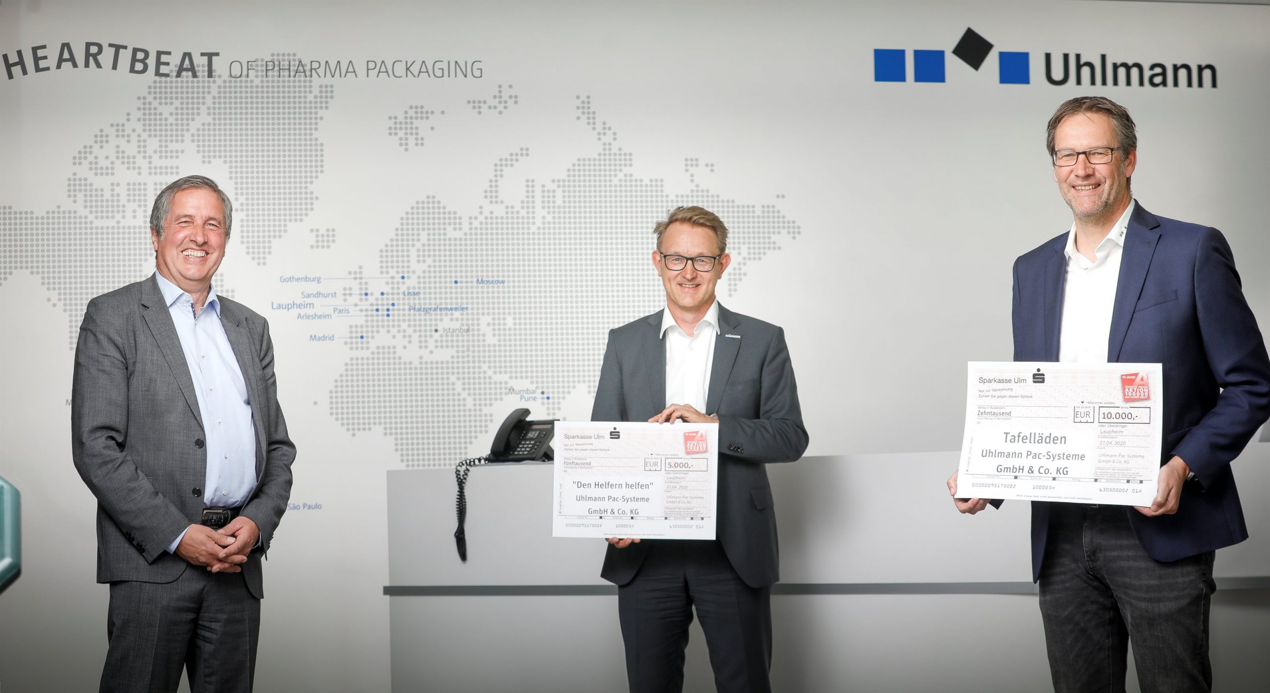 Das Unternehmen Uhlmann Pac-Systeme spendet 15.000 Euro für die regionalen Tafelläden und die Initiative „Den Helfern helfen“.