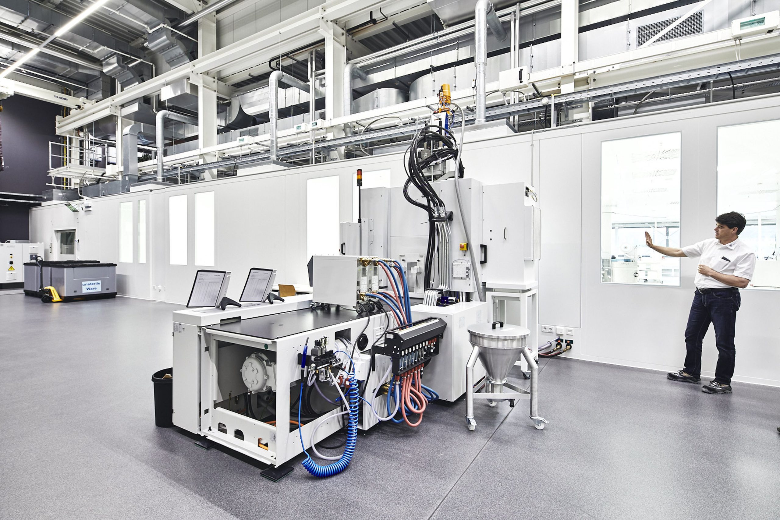 „Um diese Anforderungen zu erfüllen, haben wir eng mit dem am Projekt beteiligten Maschinenhersteller zusammengearbeitet“, so Jürgen Wolf, Projektleiter bei BC-Technology. „Die Spritzgussmaschine mit dem dazugehörigen Werkstückwechsler befindet sich außen an der Reinraumwand im Schwarzbereich des Produktionszentrums. Sie wurde jedoch so installiert, dass sie sich vom Reinraum aus bestücken und nach dem Spritzgussvorgang entladen lässt.“ Dazu werden die zu umspritzenden Rohlinge in das Werkzeug eingelegt. Anschließend wird der Drehtisch um 180 Grad zur Maschine hin gedreht. Während des Spritzgussprozesses können im Reinraum zeitgleich die im vorherigen Takt gespritzten Teile entnommen werden.