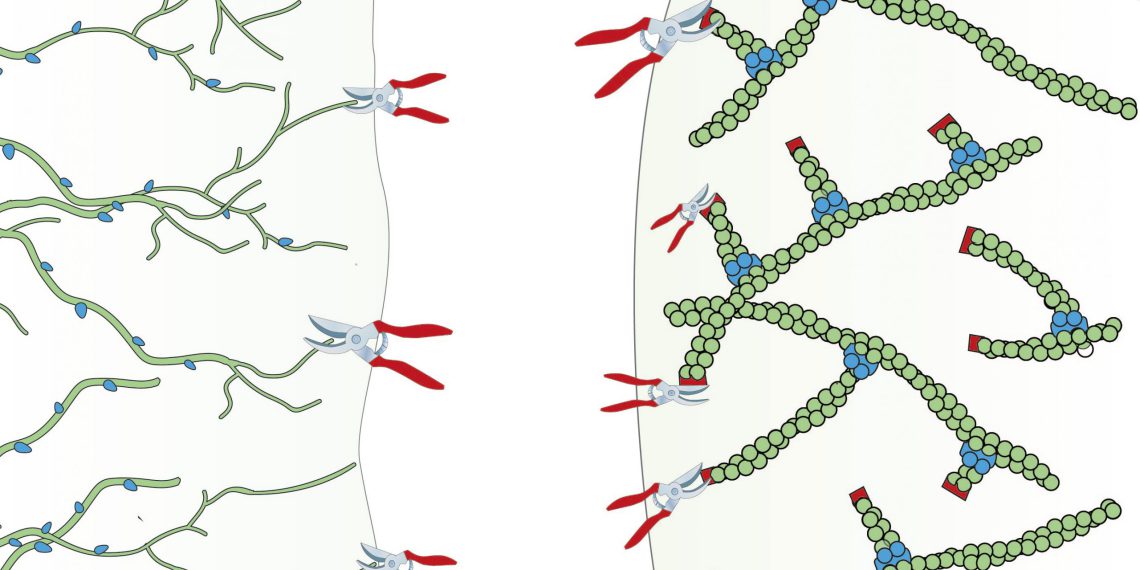 Eine optimale Kraftübertragung auf die Plasmamembran wird durch eine kontinuierliche Pflege des verzweigten Aktin-Netzwerks gewährleistet. Eine wichtige Schlüsselrolle spielt dabei das Capping-Protein, das das Wachstum von Filamenten über eine kritische Länge hinaus verhindert und die Verlängerung von unproduktiven, weit von der Zellmembran entfernten Filamenten stoppt. Das Kappen der Aktinfilamente hat also eine ähnliche Wirkung wie ein pflegender Heckenschnitt: Es hält die (Aktin-)Hecke ordentlich und in Form. Es stimuliert aber auch die Aktinverzweigung (Knospenbildung) in der Nähe der Membran (Pflanzenränder) durch den Arp2/3‑Komplex. Wie genau das Capping-Protein die Aktinverzweigung anregt, war bisher nicht bekannt.