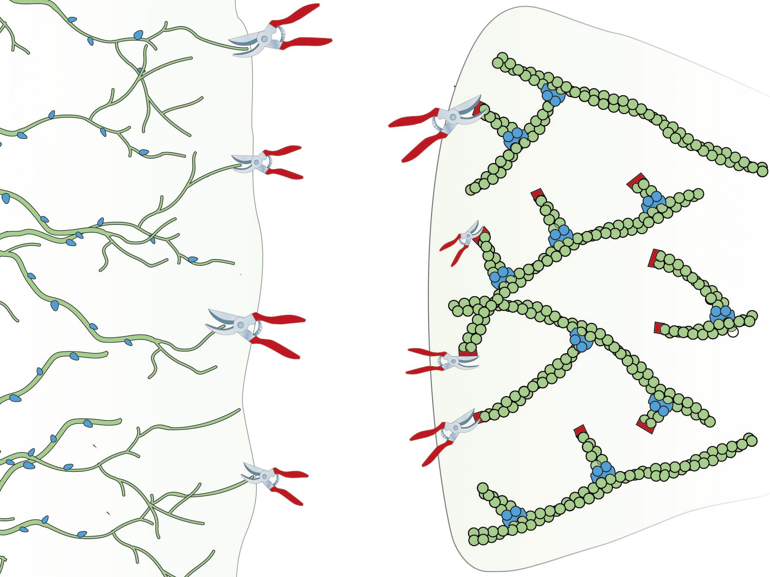 Eine optimale Kraftübertragung auf die Plasmamembran wird durch eine kontinuierliche Pflege des verzweigten Aktin-Netzwerks gewährleistet. Eine wichtige Schlüsselrolle spielt dabei das Capping-Protein, das das Wachstum von Filamenten über eine kritische Länge hinaus verhindert und die Verlängerung von unproduktiven, weit von der Zellmembran entfernten Filamenten stoppt. Das Kappen der Aktinfilamente hat also eine ähnliche Wirkung wie ein pflegender Heckenschnitt: Es hält die (Aktin-)Hecke ordentlich und in Form. Es stimuliert aber auch die Aktinverzweigung (Knospenbildung) in der Nähe der Membran (Pflanzenränder) durch den Arp2/3‑Komplex. Wie genau das Capping-Protein die Aktinverzweigung anregt, war bisher nicht bekannt.