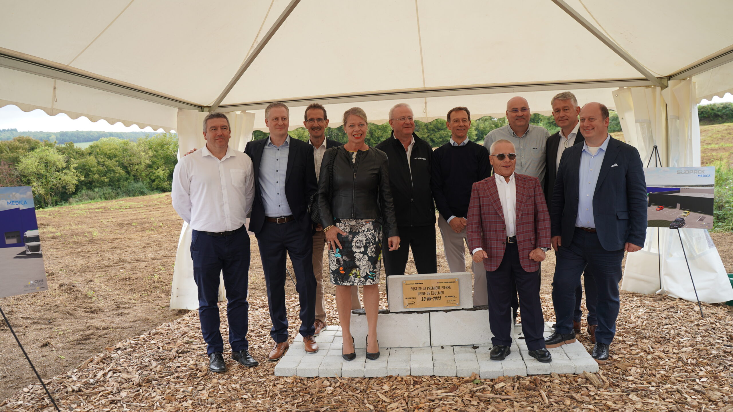 An dem offiziellen Spaten­stich nah­men neben den Gesellschaftern von Süd­pack, Frau Car­olin Grim­bach­er und Herr Johannes Rem­mele, auch der CEO der Süd­pack Gruppe, Herr Erik Bouts, sowie Thomas Freis als Geschäfts­führer von Süd­pack Med­ica und nicht zulet­zt auch der Leit­er des Investi­tion­spro­jek­tes Fred­er­ic Cov­as­so und Werk­sleit­er Samuel Wilquin teil. Chan­tal Nicoleau, die Bürg­er­meis­terin von Coul­mer, zeigte sich begeis­tert von dem Invest, welch­es auch mit der Schaf­fung neuer Arbeit­splätze verknüpft wird – eben­so wie der Vor­sitzende des örtlichen Gemein­de­ver­ban­des „Val­lées d’Auge et du Mer­ler­ault“ Sébastien Gour­del in sein­er Rede zum Fes­takt. Zu den weit­eren Gästen, die der Ein­ladung gerne gefol­gt waren, gehörten Agnès Lai­gre, die Vizepräsi­dentin des örtlichen Gemein­de­ver­ban­des „Val­lées d’Auge et du Mer­ler­ault“, Jean Pierre Fer­et, Mit­glied des Departe­mentsrats wie auch hochrangige Vertreter des Cham­bre de Com­merce et de l’In­dus­trie und der beauf­tragten Baufirmen.