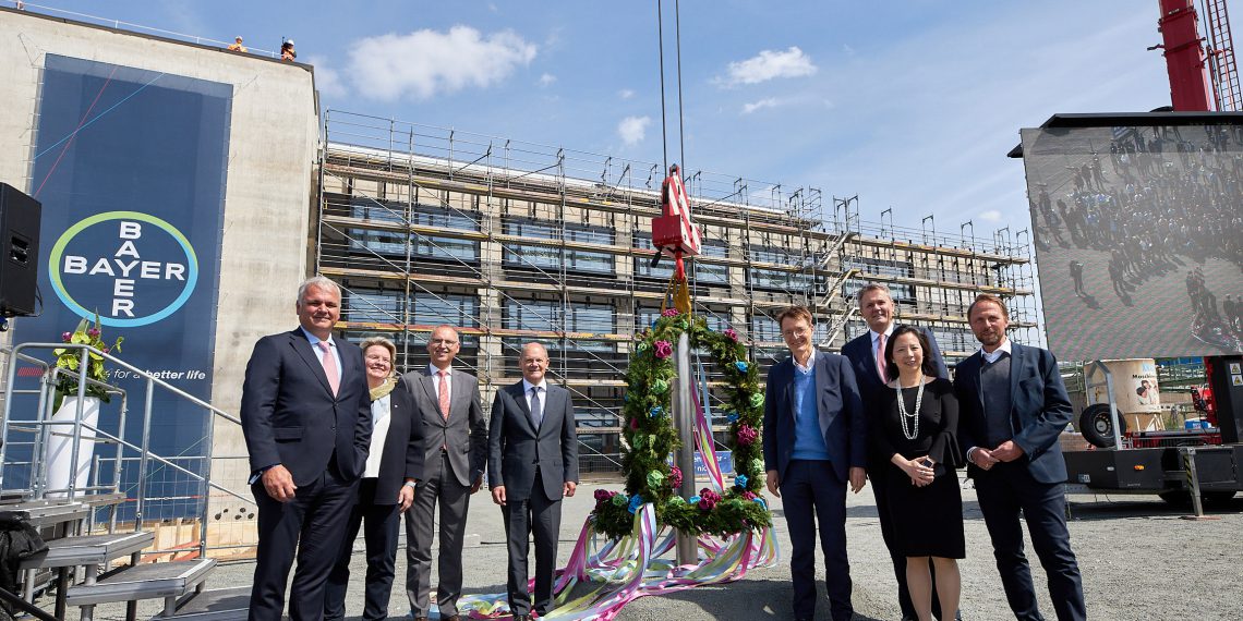 Richtfest der neuen Bayer-Arzneimittelanlage in Leverkusen (von links): Stefan Oelrich (Leiter der Bayer-Division Pharmaceuticals), Heike Hausfeld (Vorsitzende des Gesamtbetriebsrats von Bayer), Bayer-Vorstandsvorsitzender Werner Baumann, Bundeskanzler Olaf Scholz, Bundesgesundheitsminister Karl Lauterbach, Bayer-Aufsichtsratsvorsitzender Prof. Dr. Norbert Winkeljohann, Bayer-Vorstandsmitglied Sarena Lin, Uwe Richrath (Oberbürgermeister von Leverkusen)