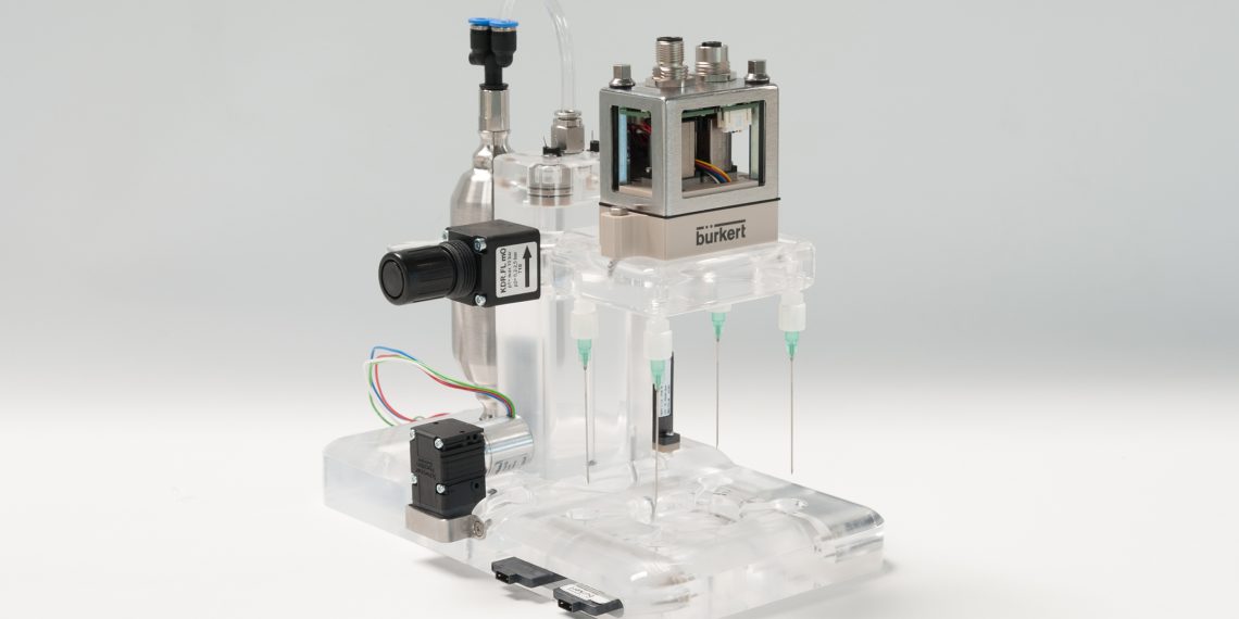 Wenn in Medizin- oder Labortechnik, Pharmaindustrie oder Lebensmittelproduktion flüssige Medien präzise in kleinen und variierenden Mengen abgefüllt werden sollen, bietet sich oft die Druck-Zeit-Dosierung als flexible und hygienische Methode an. Im Gegensatz zu mechanischen Pumpen stört keine Mechanik den Fluss des Mediums, Verunreinigungen durch Abrieb sind nicht zu befürchten und variable Mengen lassen sich mit hoher Reproduzierbarkeit dosieren. Basierend auf der Druck-Zeit-Dosierung hat Bürkert eine Systemplattform entwickelt mit einem Druck-Zeit-Dosierkopf als Kernstück, der sich innerhalb kurzer Zeit an individuelle Anforderungen anpassen lässt. Dabei unterstützt der Fluidik-Spezialist von Konzeption, Projektierung und Entwicklung bis hin zur Montage und Prüfung. Nach einer verbindlich festgelegten Time-Line kommt die komplette Dosierlösung als kompakte Einheit anschlussfertig, geprüft und mit den erforderlichen Zulassungen und Zertifikaten zum Anwender. Bürkert kümmert sich um das komplette Fluidik-Management-System vom Eingang des Mediums bis zur Dosierstelle.
