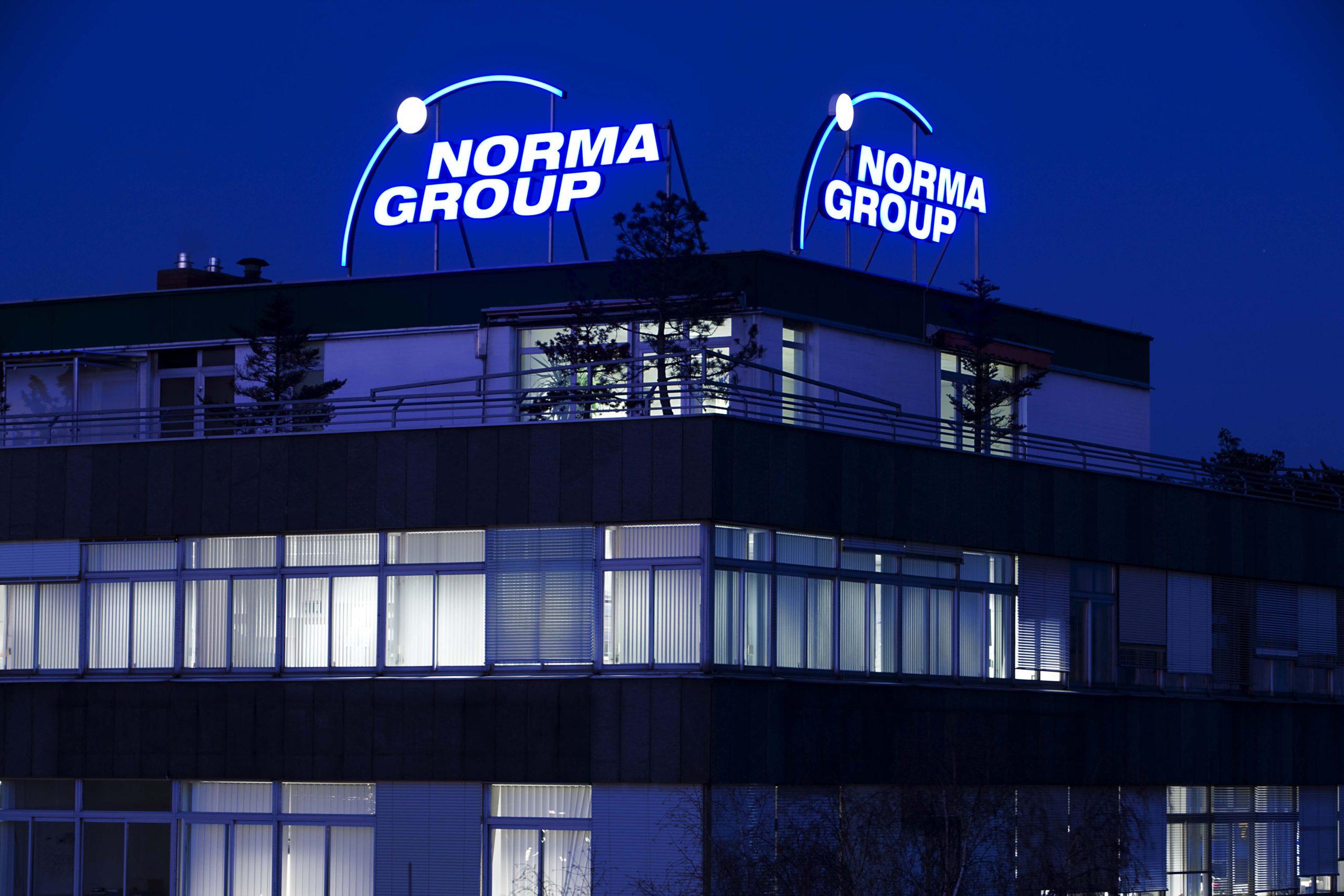 Die Norma Group Firmenzentrale in Maintal bei Nacht. (Bild: Norma Group)