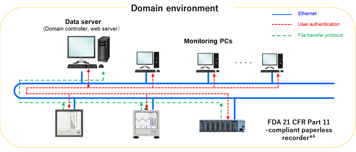 Wird ein Datenfehler von einem Überwachungs-PC erkannt, zeigt der PC je nach Einstellung des papierlosen Recorders eine Alarmmeldung an, gibt einen akustischen Alarm aus und/oder sendet eine entsprechende E‑Mail. Darüber hinaus kann auf die von einem papierlosen Schreiber erfassten Daten von jedem Webbrowser aus zugegriffen werden.