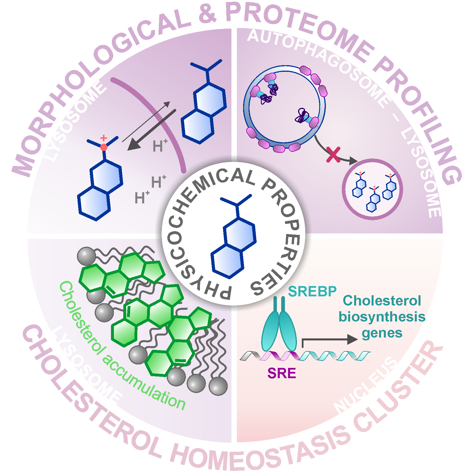 Im Lysosom erhöhen die Substanzen aus dem beschriebenen Cluster den pH-Wert und stören somit die Funktion dieses Organells und insbesondere den Cholesterinhaushalt der Zelle. Dass sich die Substanzen im Lysosom anlagern, ist nicht auf ein konkretes Zielmolekül im Lysosom sondern auf ihre chemischen und physikalischen Eigenschaften zurückzuführen, die sie durch ihre strukturelle Optimierung für eine verbesserte Löslichkeit erhalten haben.