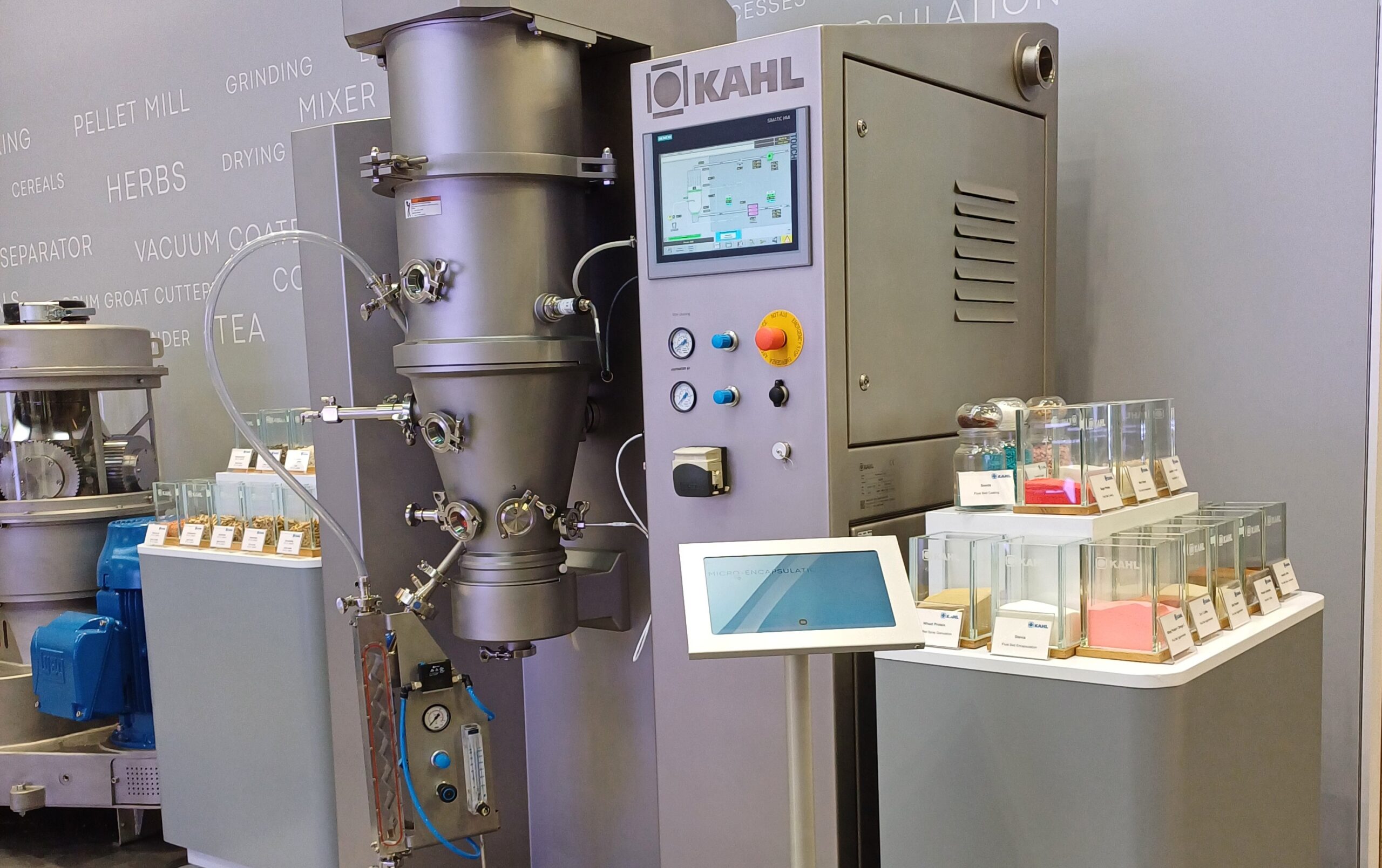 Der Messeauftritt von Aman­dus Kahl konzen­tri­ert sich auf zwei Schlüs­selver­fahren für die Ver­ar­beitung, Vere­delung und Dosier­barkeit unter­schiedlich­ster Stoffe: die Pel­letierung und die Wirbelschicht­tech­nolo­gie. Vorgestellt wer­den unter anderem die kle­in­ste Wirbelschich­tan­lage LFB mini S sowie zwei Flach­ma­trizen­pressen, darunter die kom­pak­te Presse 14–175 mit Untergestell. Diese eignet sich ins­beson­dere für Anwen­dun­gen mit begren­ztem Platzange­bot oder für Labore. Darüber hin­aus wird die leis­tungsstarke Presse 33–600 in Aktion gezeigt. Bei­de Pressen kön­nen für Anwen­dun­gen in der phar­mazeutis­chen Indus­trie option­al nach GMP-Richtlin­ien zer­ti­fiziert wer­den. Die „Good Man­u­fac­tur­ing Prac­tice“, also „gute Her­stel­lung­sprax­is“, beze­ich­net Richtlin­ien, die gewährleis­ten, dass Arzneimit­tel, Lebens­mit­tel und Kos­meti­ka unter hygien­is­chen Bedin­gun­gen repro­duzier­bar und sich­er hergestellt werden.