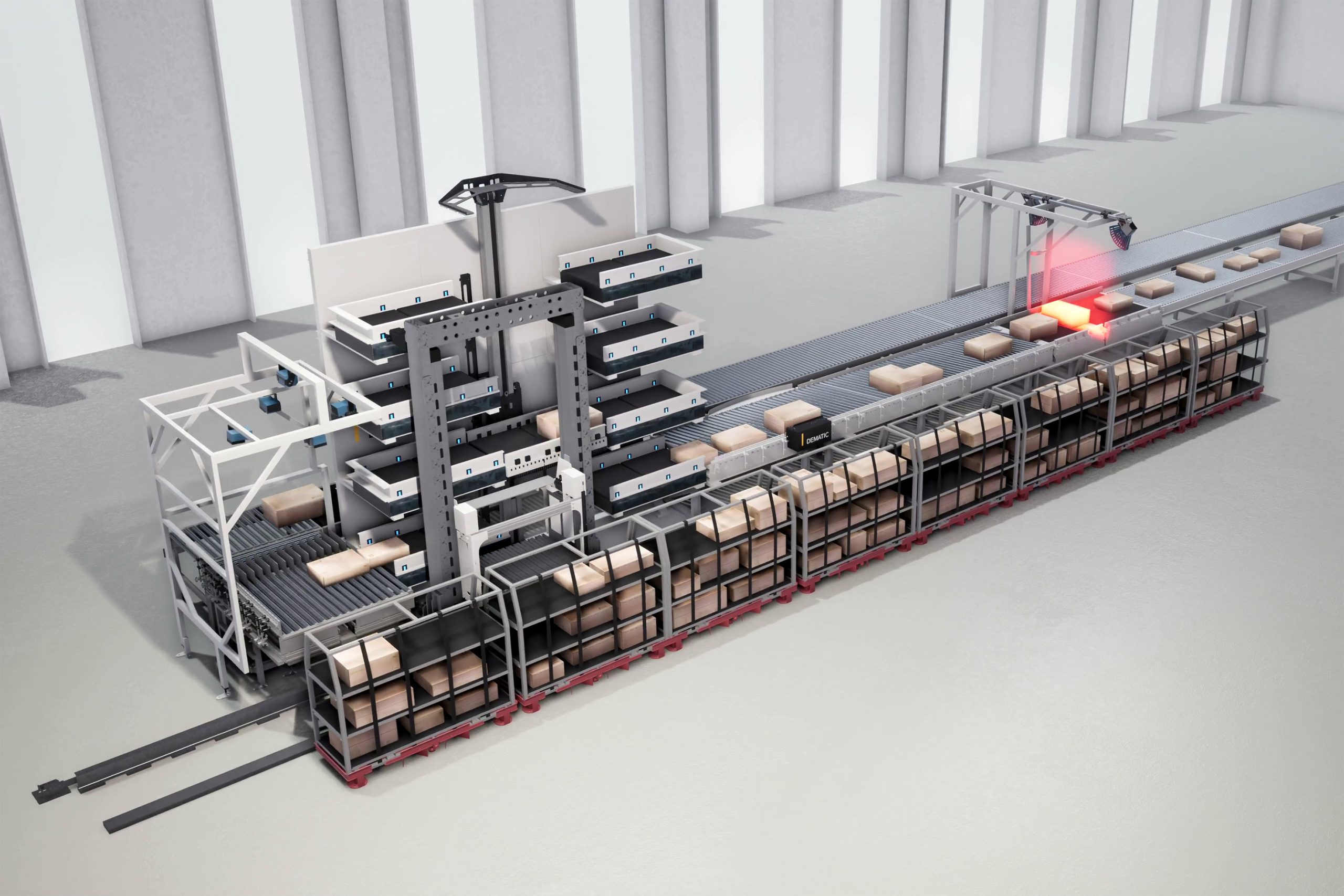 Im Verteilzentrum von Entwicklungspartner DPD ist das Subsystem aktuell im Testbetrieb. Dort greift Dematic PackMyRide die Pakete zunächst vom Intralogistiksystem ab und transportiert sie über Förderbänder zu einer Scan-Einheit, wo für die optimale Sortierung Volumen, Gewichts- und Barcodedaten verifiziert werden. Im Dematic Sequencing Tower werden die Pakete anschließend zwischengelagert, um sie in der gewünschten Reihenfolge an ein Pusher-System weiter zu geben. An dieser Stelle unterscheidet das System zwei Arten von Paketen, erklärt Jarr: „Sollte etwas mit der Sendung nicht in Ordnung sein, wird zum manuellen Arbeitsbereich umgeleitet.“ Andernfalls wird das Paket auf ein Regalbediengerät geladen, welches sich entlang mehrerer, aneinander aufgereihter, mobiler Regaleinheiten bewegt und die Pakete an gewünschter Stelle einsortiert. Ist ein Regal vollständig beladen, kann es einfach aus der Beladungsanlage herausgenommen und in das Zustellfahrzeug befördert werden. Dematic ermöglicht hier alternativ den automatischen Transport mit FTS.